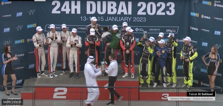 Οι νικητές είναι οι Mohammed Saud Fahad al Saud, Diego Menchaca, Jean-Baptiste Simmenauer, Jens Klingmann και Dries Vanthoor, που οδήγησαν ένα ίδιο αυτοκίνητο, ενώ ο Rossi είχε ομόσταυλους τους Tim Whale, Sean Gelael, Max Hesse και Maxime Martin. Η ομάδα Herberth-Porsche τερμάτισε στη δεύτερη θέση ανάμεσα στις δύο BMW.