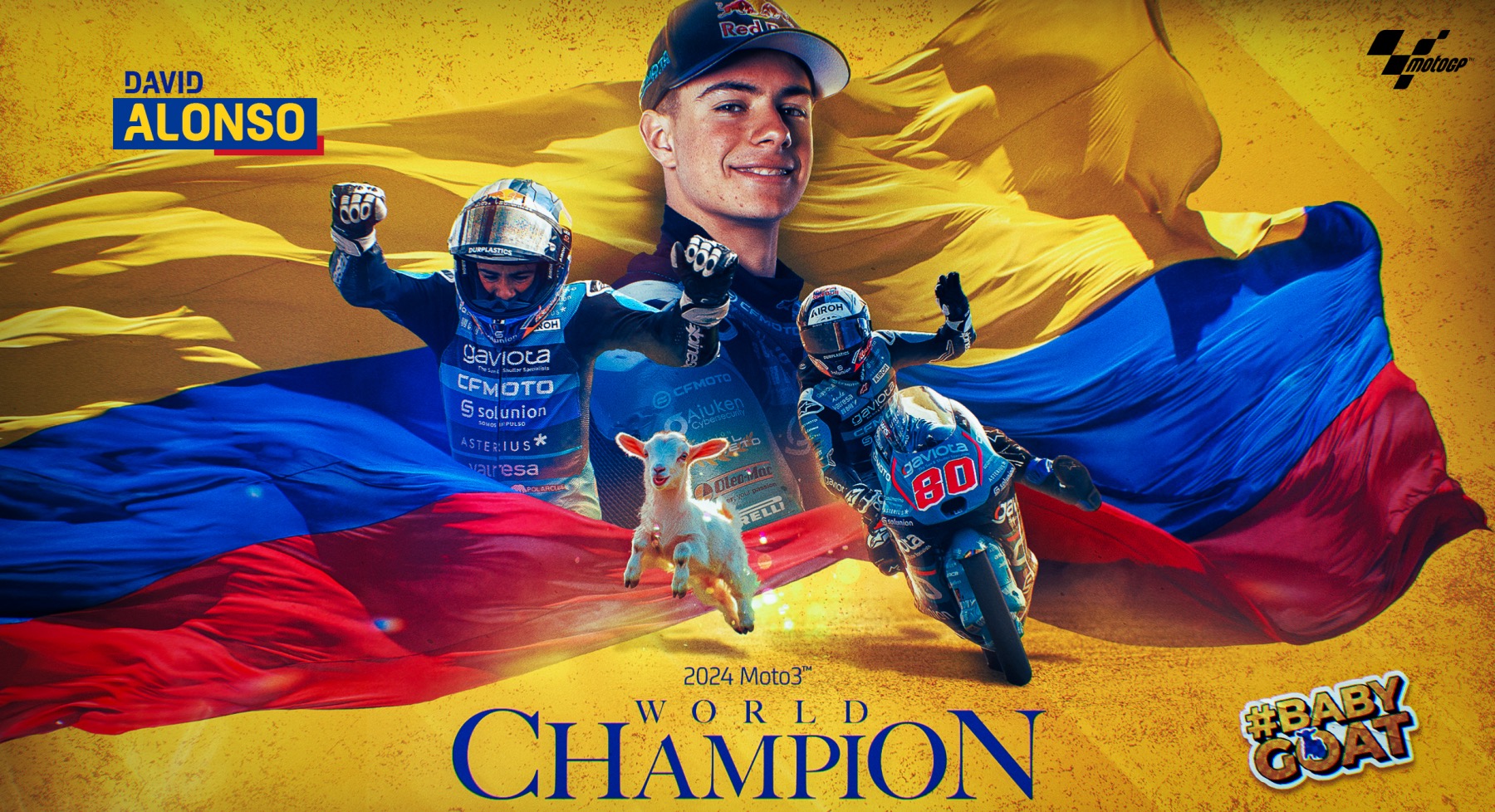 Ο David Alonso (CFMOTO Gaviota Aspar Team) είναι ο Παγκόσμιος Πρωταθλητής FIM Moto3™ του 2024! Έχοντας σημειώσει 10 εντυπωσιακές νίκες μέχρι στιγμής αυτή τη σεζόν, ολοκλήρωσε το Πρωτάθλημα στην Ιαπωνία για να γράψει ιστορία ως ο πρώτος Κολομβιανός αναβάτης που κέρδισε έναν τίτλο Grand Prix σε οποιαδήποτε κατηγορία.
