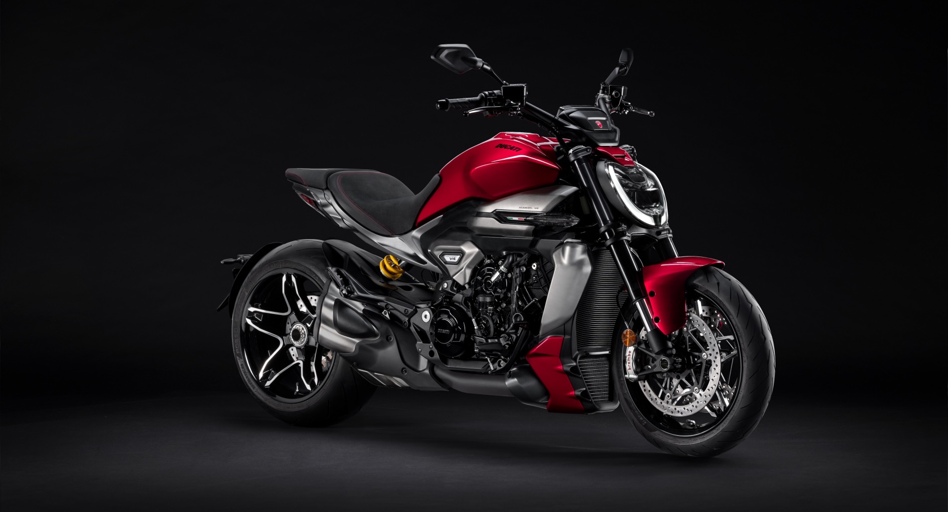 Η μυώδης δεξαμενή καυσίμου τραβάει το βλέμμα με τα νέα και ιριδίζοντα χρώματα Black Lava και Burning Red, που δημιουργήθηκαν ειδικά για την XDiavel V4, τα οποία παράγουν ρευστές και κομψές αντανακλάσεις όταν πέφτει το φως. Τα εμπρός και πίσω φώτα και οι δυναμικοί δείκτες κατεύθυνσης που είναι ενσωματωμένοι στα πλευρικά πάνελ, φυσικά πλήρως LED, συμβάλλουν στην αδιαμφισβήτητη χαρακτηριστική εμφάνιση της XDiavel V4. Το μπροστινό φως DRL, με το διπλό προφίλ C, τραβά την προσοχή σε ένα παιχνίδι αντιθέσεων με την εσωτερική όψη του προβολέα. Μαζί με την πίσω φωτεινή μονάδα, τοποθετημένη κάτω από το πίσω φτερό, χαιρετά τον αναβάτη με το “Welcome Effect” όταν ενεργοποιείται η οθόνη στο ταμπλό, τονίζοντας την εκλέπτυνση και την προσοχή σε κάθε λεπτομέρεια της XDiavel.