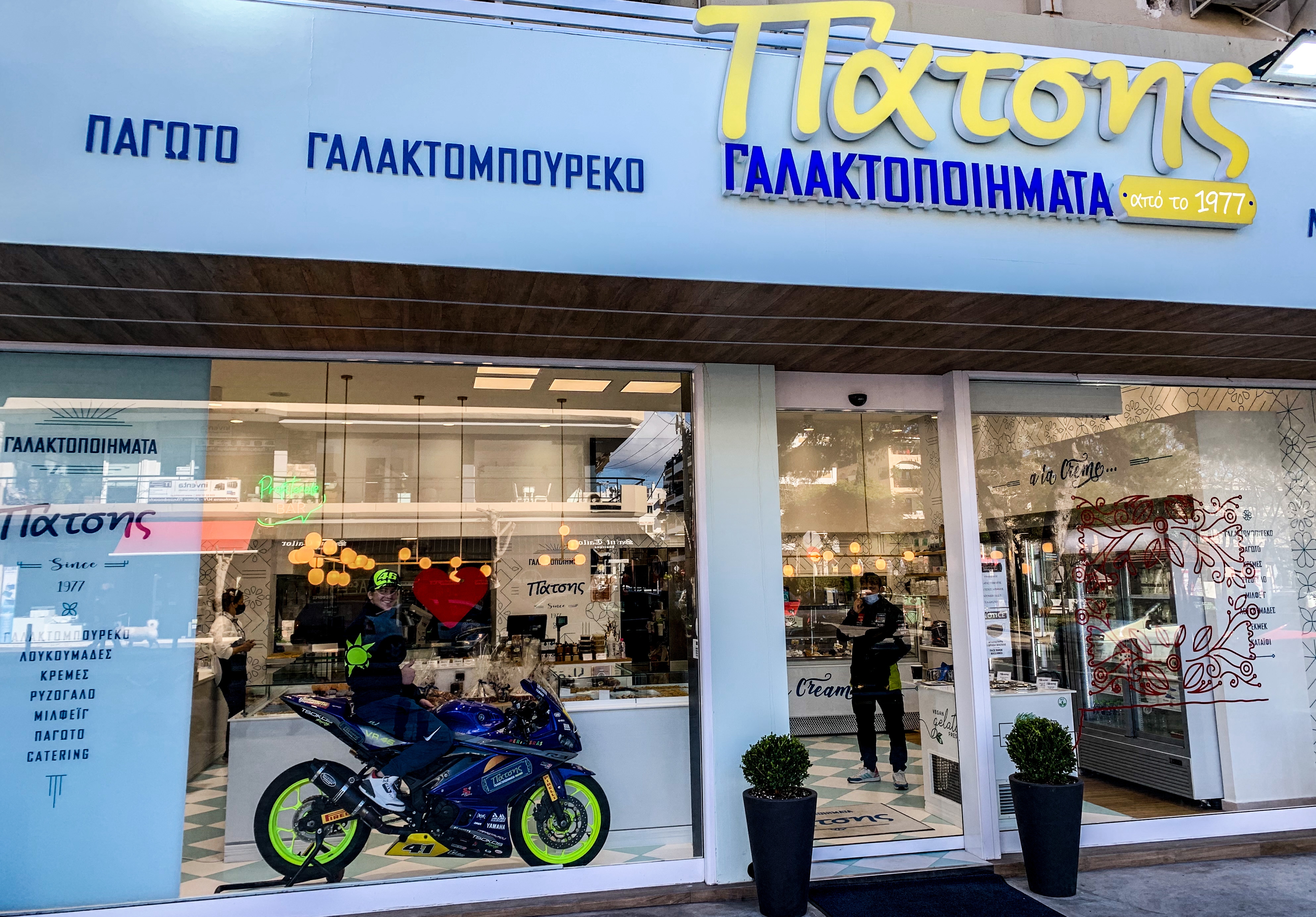 Ο Γιάννης Περιστεράς βρέθηκε στον ωραίο αυτό χώρο που θα φιλοξενήσει για μια εβδομάδα τη μοτοσυκλέτα του, συνάντησε τον κ. Γιώργο Πάτση και δοκίμασε το νέο προϊόν, που είναι το “φρέσκο γάλα Πάτσης Γαλακτοποιήματα”.