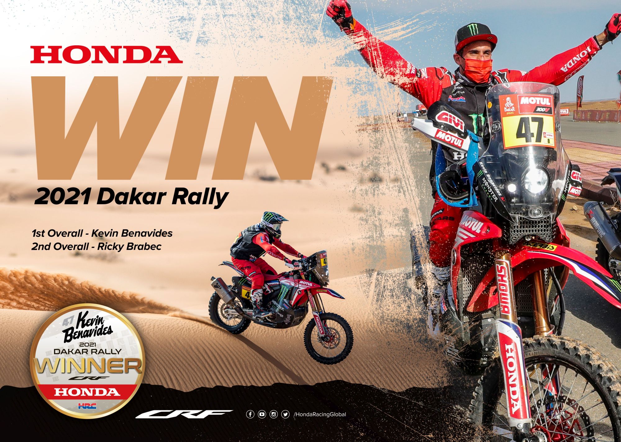 Η Monster Energy Honda Team θριάμβευσε και φέτος στο Ράλλυ Ντακάρ, αποσπώντας τη νίκη και κάνοντας το 1-2 για την ομάδα που είχε τον έλεγχο καθ’ όλη την διάρκεια του αγώνα. Ο Kevin Benavides είδε το όνειρο του να γίνεται πραγματικότητα, καθώς αναδείχτηκε πρωταθλητής του Ντακάρ. Ο Ricky Brabec εξασφάλισε τη δεύτερη θέση γενικής στην τελευταία ειδική διαδρομή.