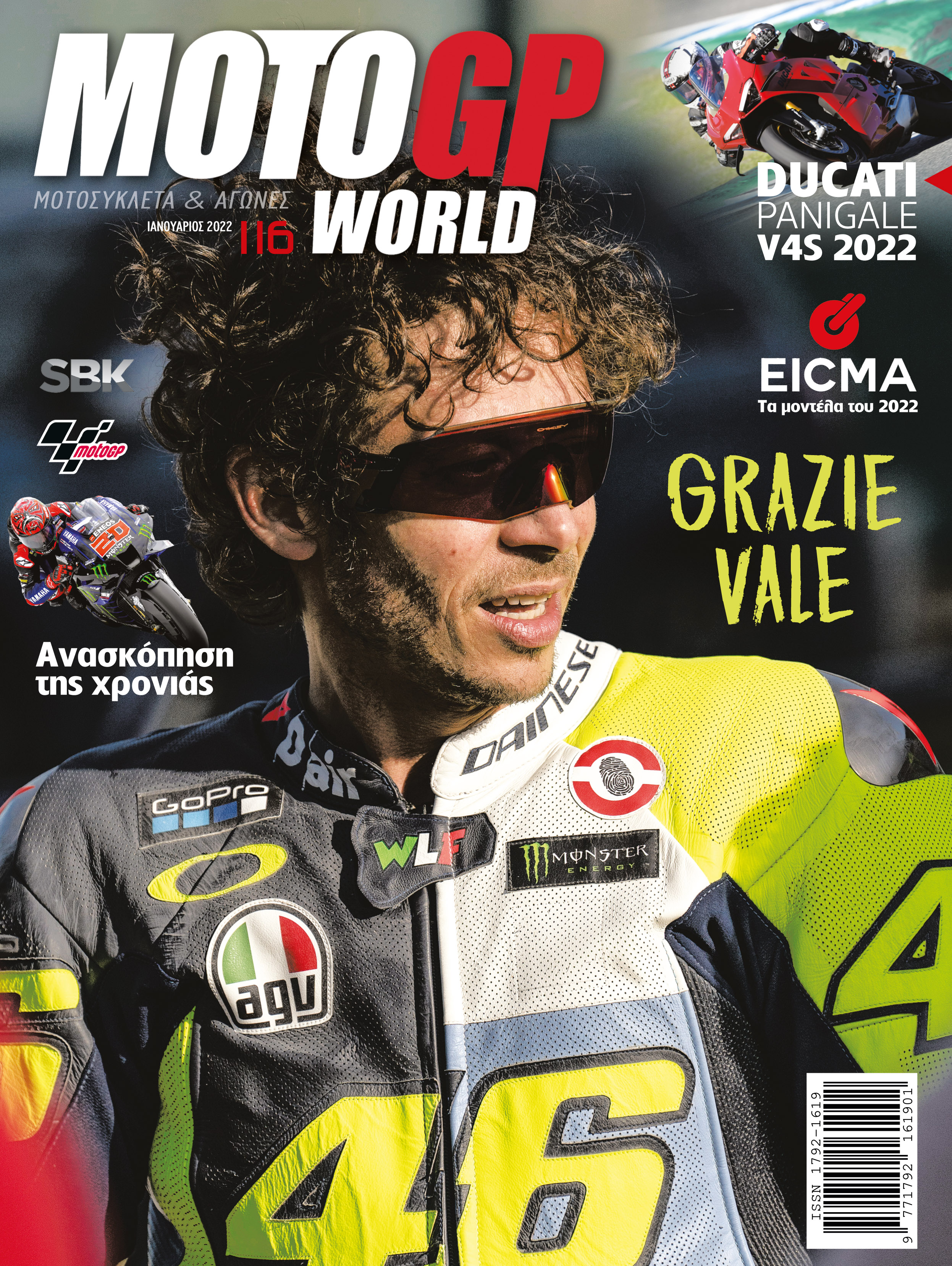 To περιοδικό που μας φέρνει τον παλμό του συναρπαστικότερου αθλήματος του μηχανοκίνητου αθλητισμού, του MotoGP βέβαια, κυκλοφορεί με την επετειακή έκδοση που έχει αφιερώσει το εξώφυλλό της στο “Grazie Vale” που ακούστηκε σε όλες τις πίστες του κόσμου από το καλοκαίρι και μετά, όταν ο Θρύλος του MotoGP Valentino Rossi ανακοίνωσε την απόφασή του να αποσυρθεί από την αγωνιστική δράση μετά από 26 χρόνια στα Grand Prix! Μαζί και το ανάλογο αφιέρωμα και μια ειδική σελίδα με όλη την καριέρα του “Γιατρού” σε νούμερα!
