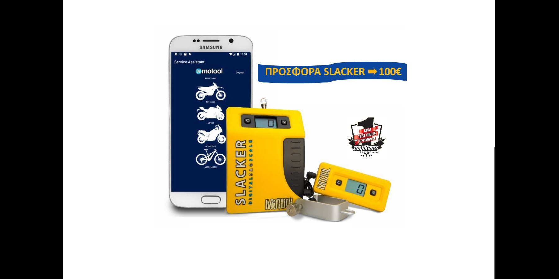 Με την εφαρμογή Motool Service Assistant θα έχετε ένα γρήγορο και ακριβές αποτέλεσμα για τις ρυθμίσεις sag (στατικό και με οδηγό) των αναρτήσεων εμπρός και πίσω, ένα pdf με οδηγίες χρήσης για το Slacker και βίντεο για μοτοσυκλέτες Δρόμου, Οff-Road, Adventure και MTB.