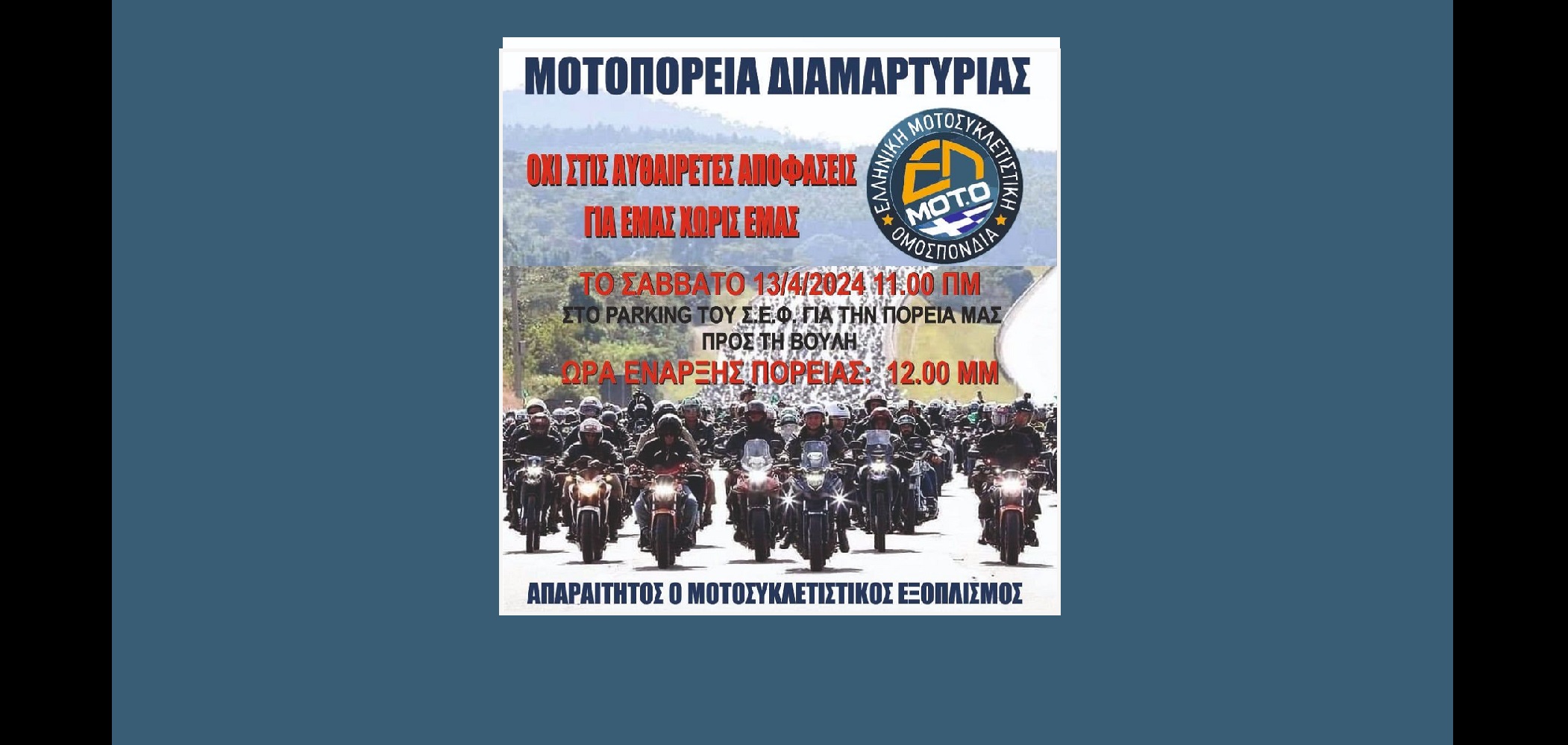 Η Ελληνική Μοτοσικλετιστή Ομοσπονδία – ΕΛ.ΜΟΤ.Ο έχοντας υψηλό το αίσθημα ευθύνης της εκπροσώπησης των Ελλήνων Μοτοσικλετιστών, με αφορμή τις τελευταίες αυξήσεις στις τιμές των διοδίων, προχωρά σε Μοτοπορεία διαμαρτυρίας το Σάββατο 13 Απριλίου 2024, η οποία θα ξεκινήσει από το ΣΕΦ ώρα 12:00μμ. και θα καταλήξει στην Πλατεία Συντάγματος με την επίδοση Ψηφίσματος.