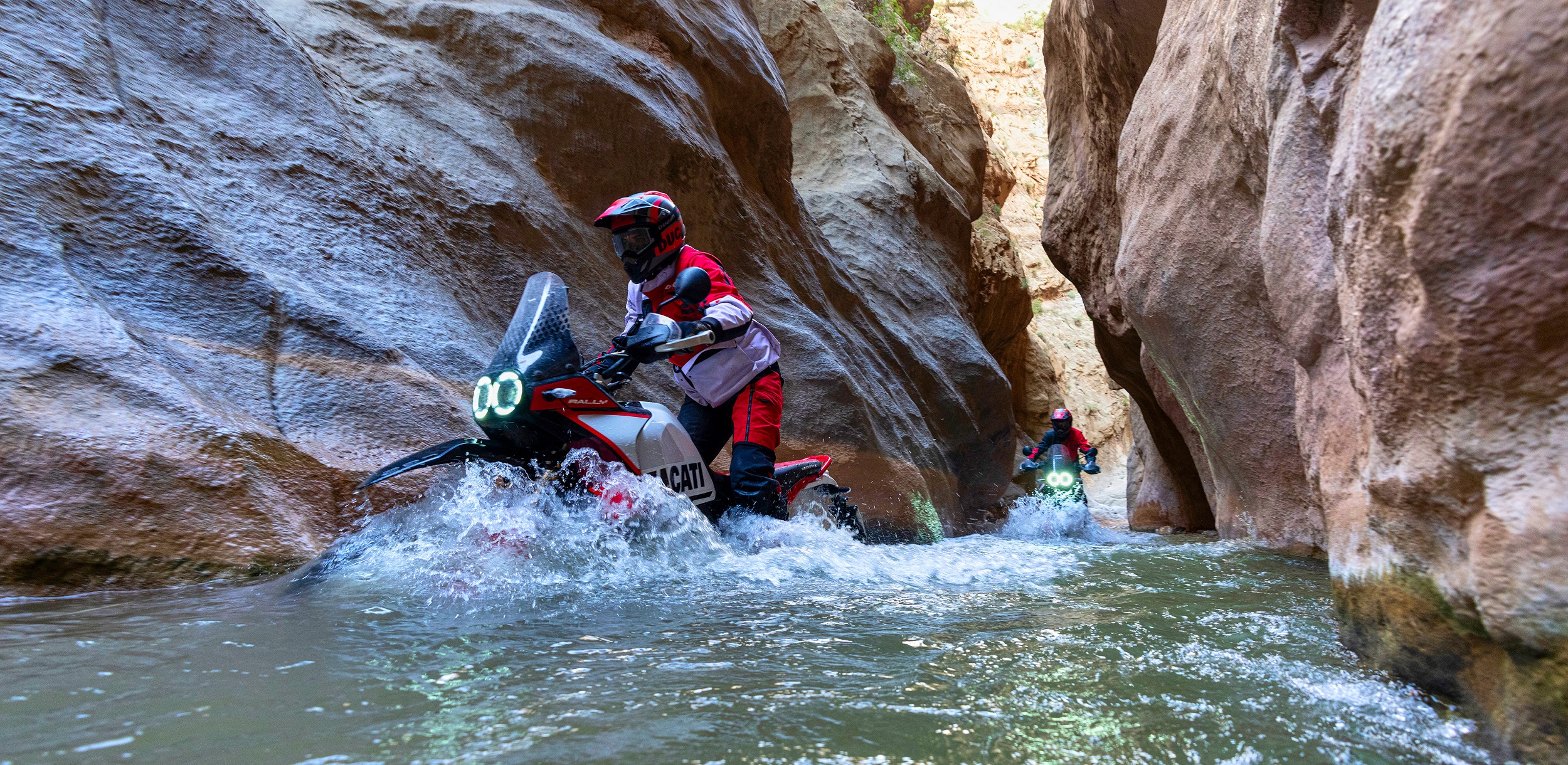 Ο δικύλινδρος κινητήρας Testastretta 11° της Ducati και το ισχυρό, ελαφρύ ατσάλινο πλαίσιο αποδεικνύουν για άλλη μια φορά, για την ικανότητα τους να αντέχουν ακόμη και τις δύσκολες καταπονήσεις σε συνθήκες εκτός δρόμου.