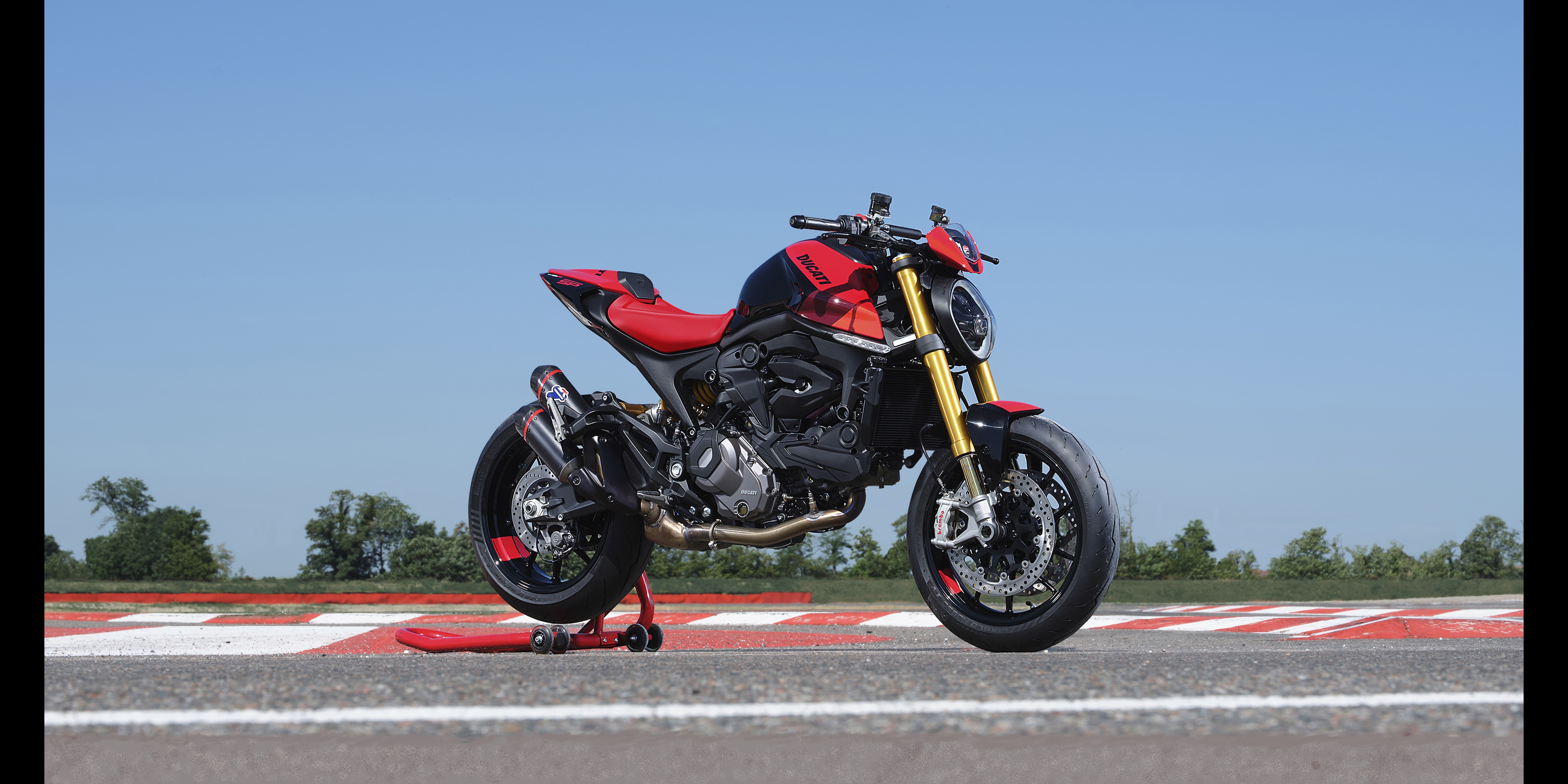 Οι σπορ δυνατότητες της Monster SP ενισχύονται ακόμα περισσότερο από το αμορτισέρ τιμονιού, το οποίο βελτιώνει την σταθερότητα κατά την φάση της επιτάχυνσης και στις στροφές. Όπως επίσης και με την παρουσία ως στάνταρ εξοπλισμού των ελαστικών Pirelli Diablo Rosso IV, τα οποία αποτελούν την κορυφαία πρόταση του κατασκευαστή ελαστικών για σπορ οδήγηση εκτός πίστας. Επιπλέον, υπάρχουν νέες ρυθμίσεις στα Προγράμματα Οδήγησης και συνεπώς σε όλα τα ηλεκτρονικά συστήματα, έτσι ώστε να αξιοποιηθούν στο μέγιστο βαθμό οι αλλαγές που έγιναν στο πλαίσιο. Παράλληλα ενσωματώνεται και το νέο riding mode – Wet – το οποίο προσφέρει τη μεγαλύτερη δυνατή ασφάλεια κατά την κίνηση της μοτοσυκλέτας σε βρεγμένους δρόμους.