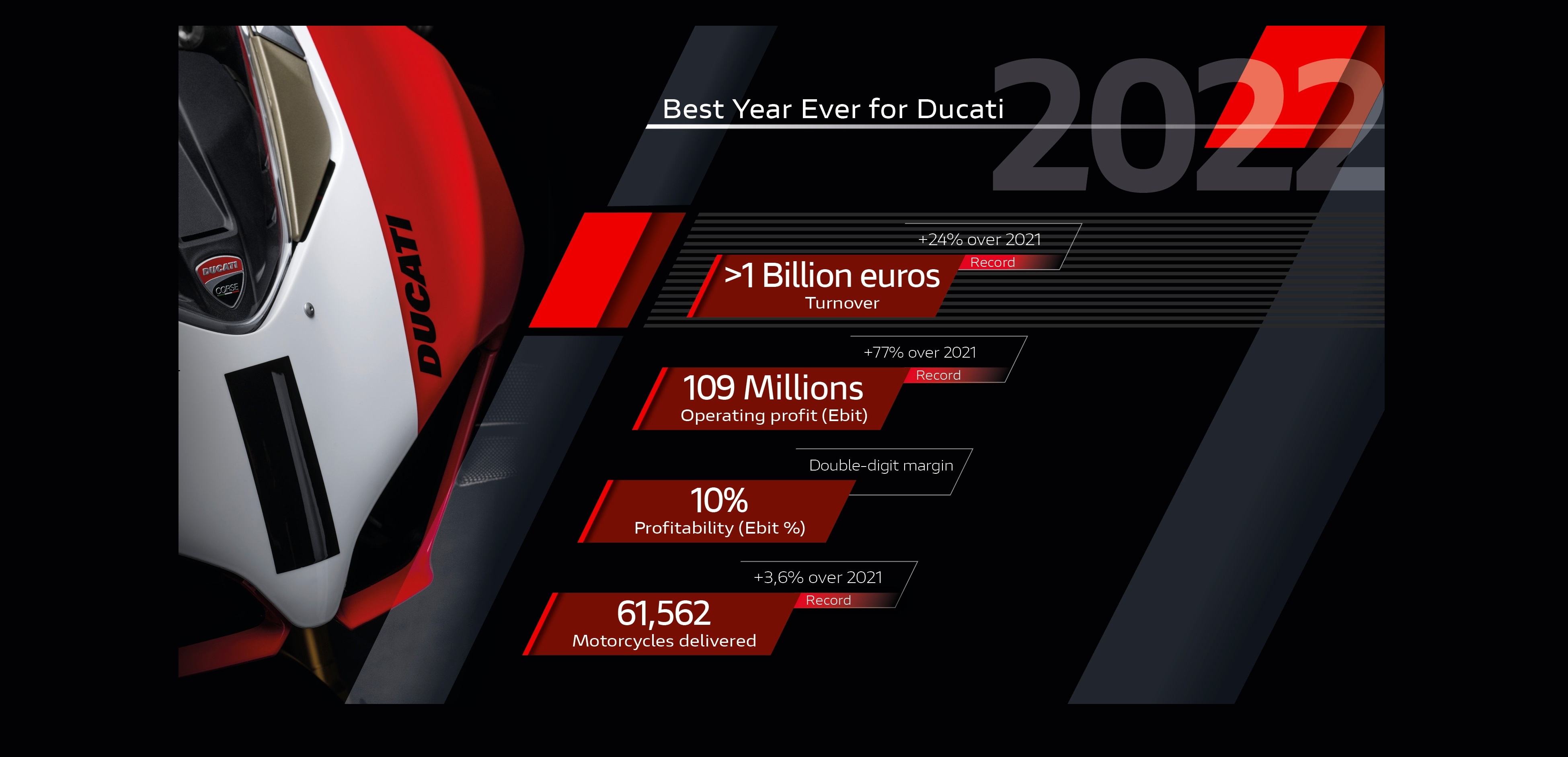 Το 2022 ήταν εξαιρετικό και ως προς τα εμπορικά αποτελέσματα. Η Ducati έκλεισε τη χρονιά με ρεκόρ 61.562 μοτοσυκλετών που παραδόθηκαν σε Ducatisti σε όλο τον κόσμο, σημειώνοντας αύξηση 3,6% σε σχέση με το 2021.