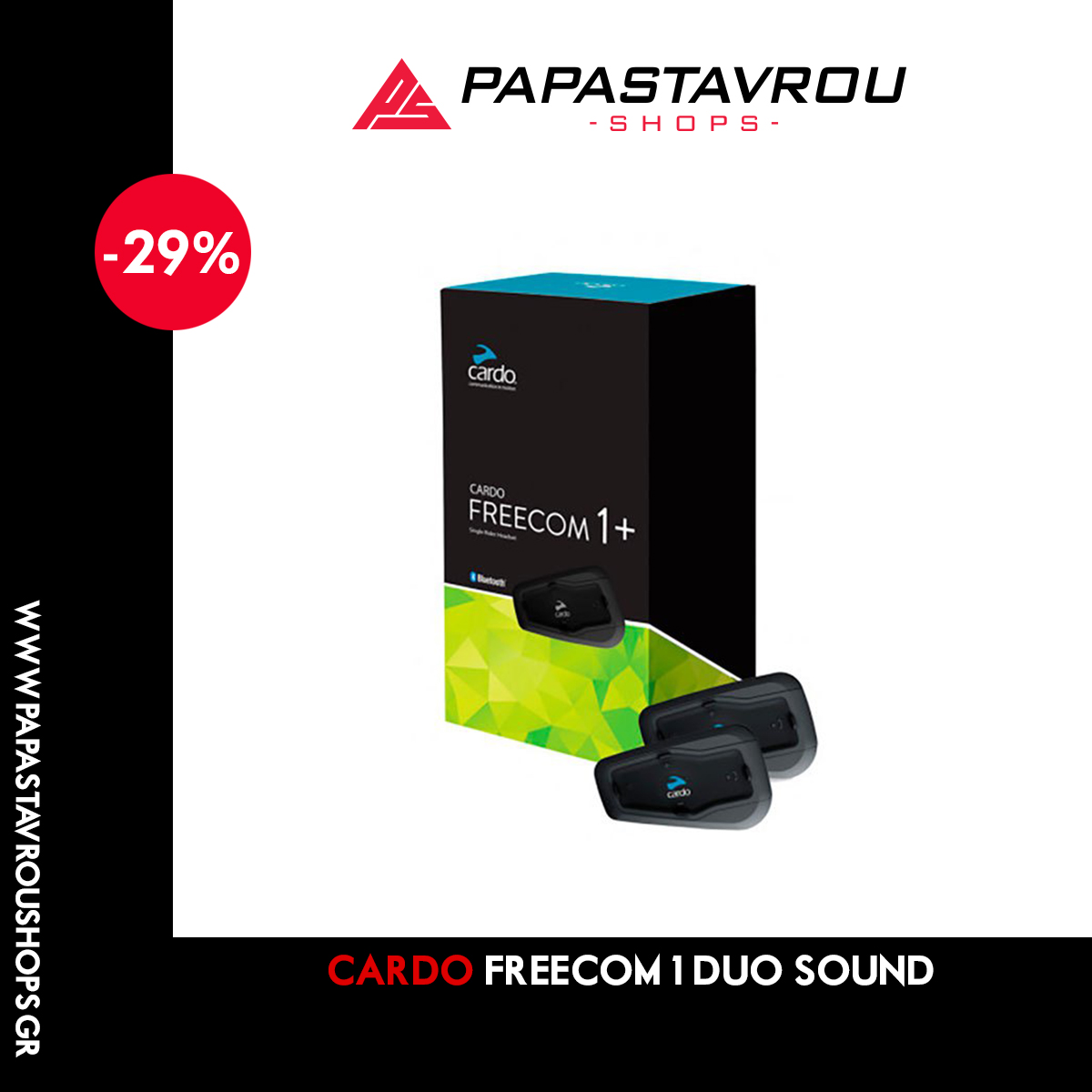 Στα Papastavrou Shops Ενδοεπικοινωνία Freecom 1+ Duo της Cardo. Σύνδεση του αναβάτη με το κινητό του και τον συνεπιβάτη.