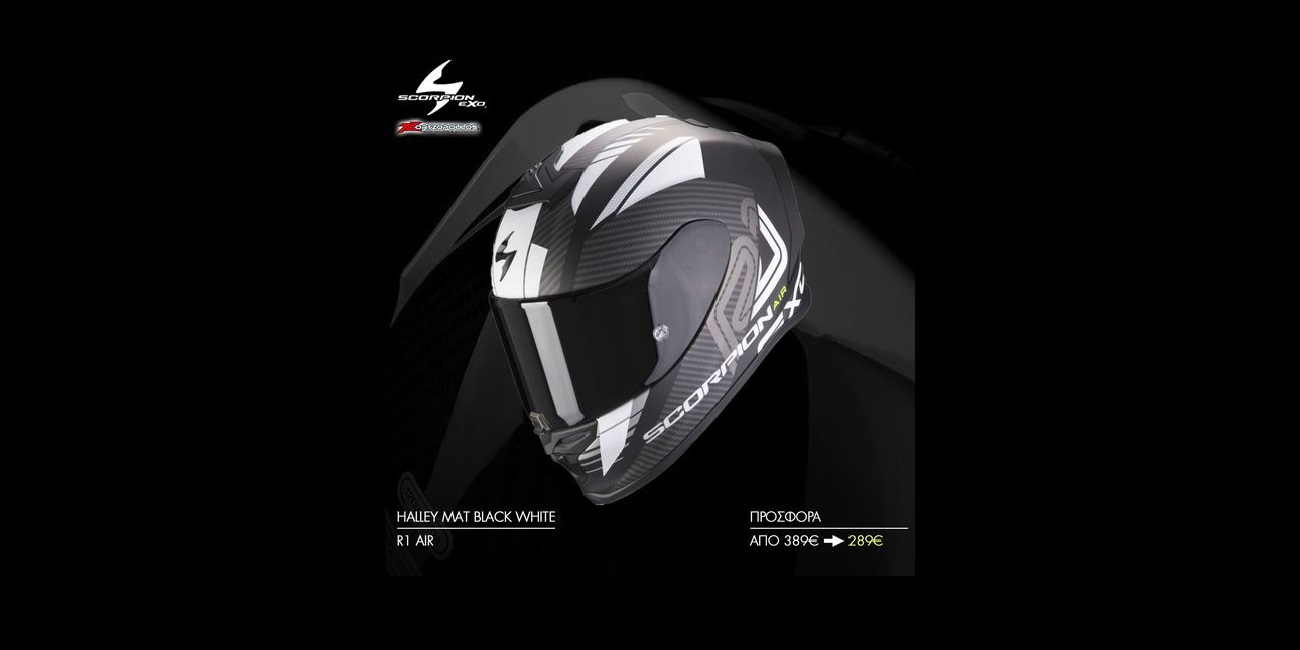Το SCORPION EXO R1 AIR HALLEY MAT BLACK WHITE Τώρα με νέα τιμή προσφοράς: 289€ (απο 389€)