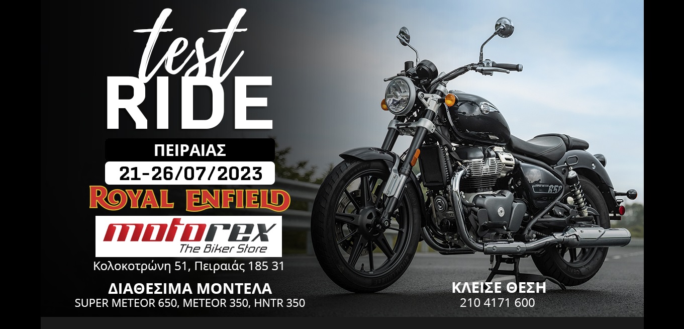 Η ROYAL ENFIELD Hellas ενημερώνει ότι τα μοντέλα SUPER METEOR 650, METEOR 350 & HNTR 350 θα είναι διαθέσιμα για Test Ride στον Πειραιά στις 21–26 Ιουλίου 2023, στην εταιρεία MOTOREX, Κολοκοτρώνη 51 ΤΚ 18531 τηλ.: 2104171600 και email: info@motorex.gr