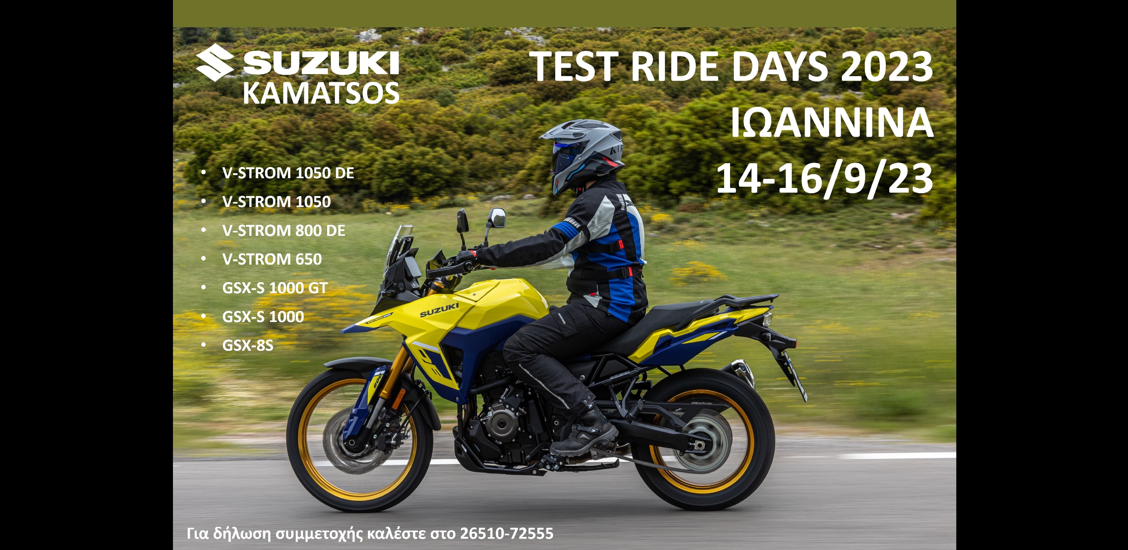 Aπό την Πέμπτη 14 έως και το Σάββατο 16 Σεπτεμβρίου ’23 θα διεξαχθούν test rides των Suzuki motorcycles στον επίσημο έμπορο KAMATSOS MOTO στα Ιωάννινα.