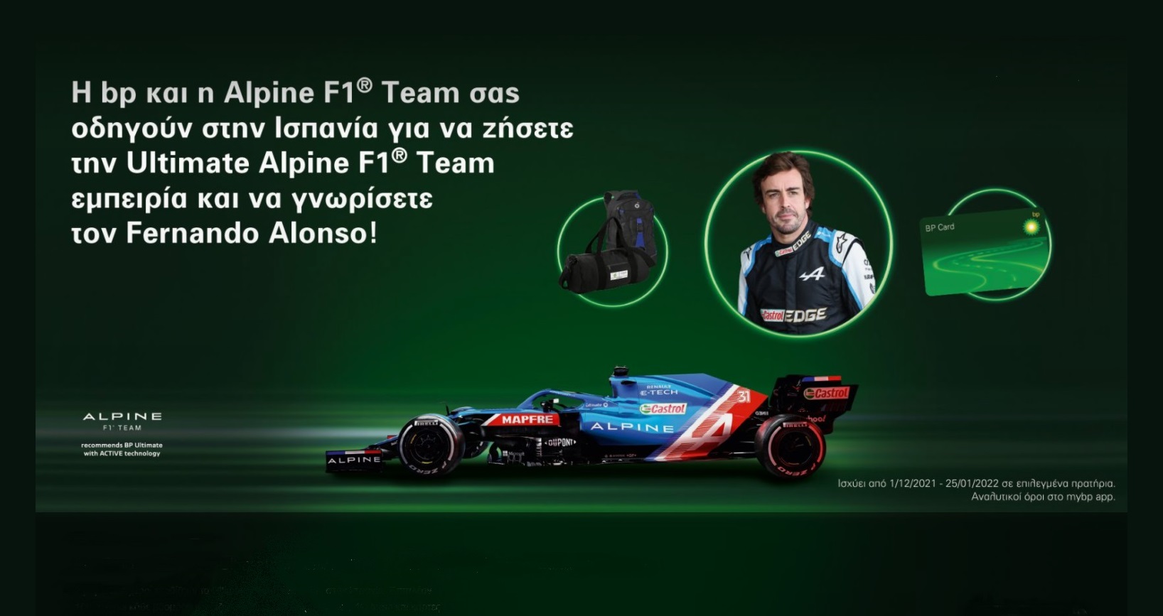 2 μεγάλοι τυχεροί κερδίζουν το Ultimate δώρο, ένα ταξίδι στην Ισπανία. Επιπλέον 100 τυχεροί κάθε βδομάδα κερδίζουν συλλεκτικά δώρα Alpine F1® team και κάρτες καυσίμων BP αξίας 100 ευρώ