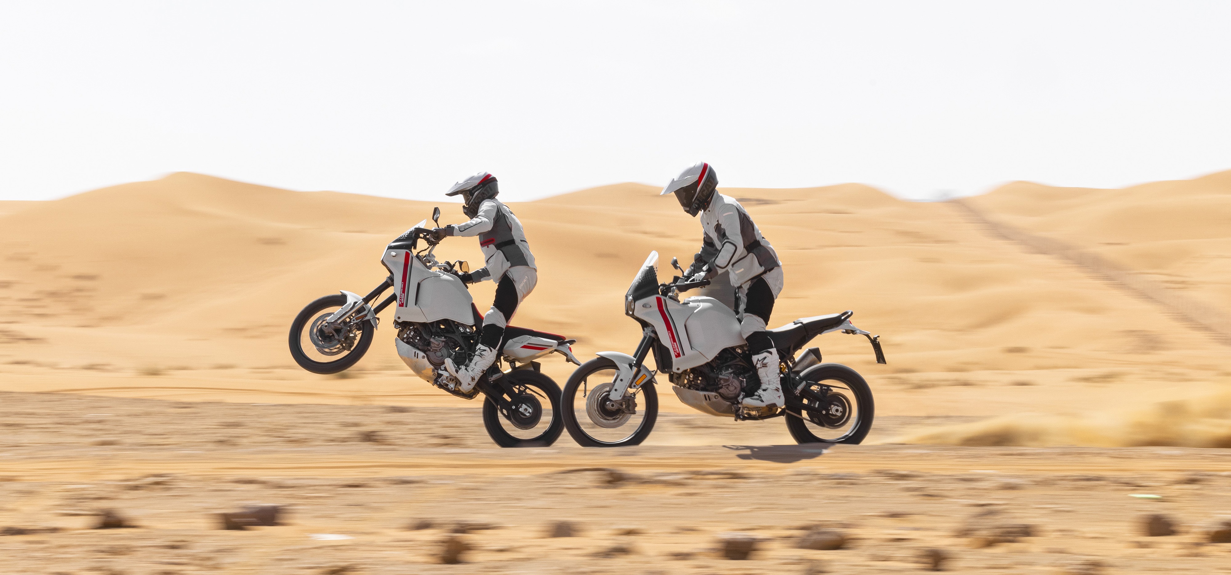 Με τροχούς 21” εμπρός και 18” πίσω, με αναρτήσεις μεγάλων διαδρομών, αρκετή απόσταση από το έδαφος και με τον L2 Testastretta 11° κινητήρα η DesertX έχει σχεδιαστεί για να κάνει με το παραπάνω αυτό που δείχνει ότι είναι.