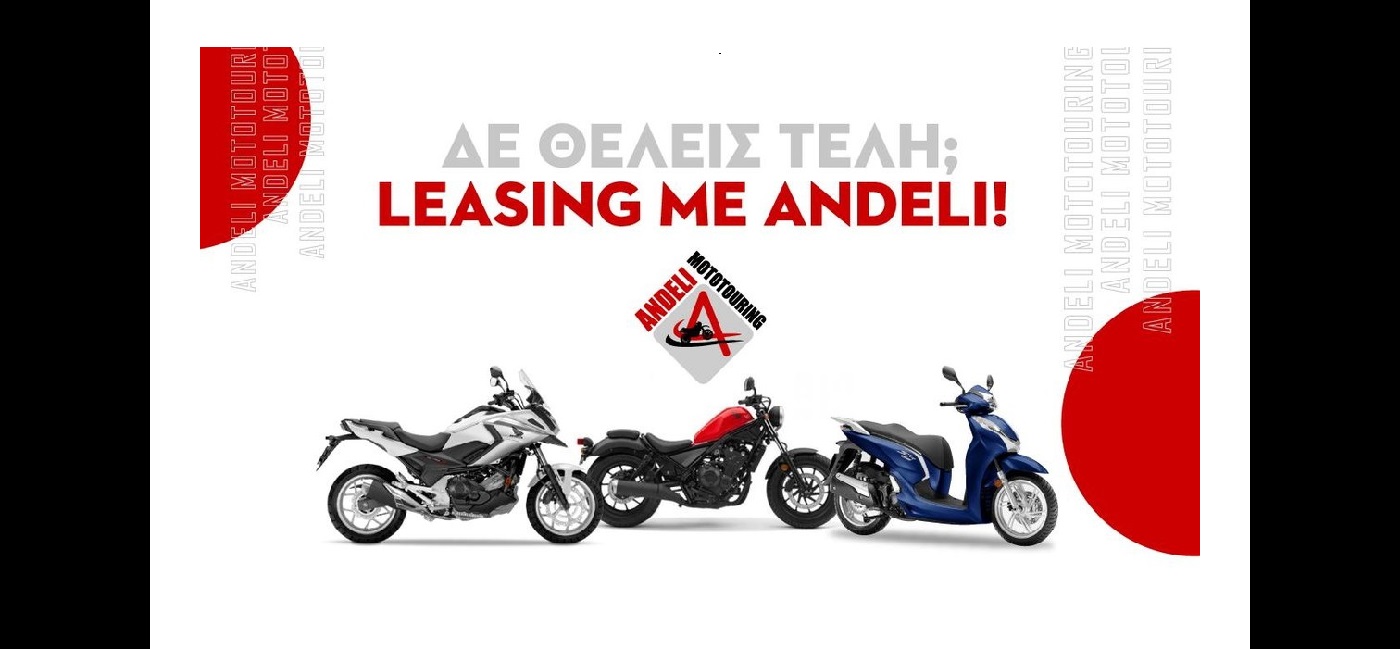 Η Andeli είναι μία 100% Ελληνική εταιρεία, η πρώτη στον χώρο που δραστηριοποιήθηκε στο Leasing μοτοσυκλετών και scooter. Kαλύπτει τις ανάγκες μεμονωμένων μοτοσυκλετιστών αλλά και ομάδων από αναβάτες που θέλουν να χαρούν το μαγικό κόσμο της μοτοσυκλέτας. Πέραν της δυνατότητας που δίνει για μακροχρόνια μίσθωση μοντέλων του κορυφαίου κατασκευαστή Honda, επιπρόσθετα παρέχει βραχυχρόνια ενοικίαση μοτοσυκλετών και scooter κάθε τύπου και κυβισμού. Ταυτόχρονα διοργανώνει και μοτοσυκλετιστικές εκδρομές σε Ελλάδα και εξωτερικό με αναγνωρισμένους F.I.M Moto Tour Assistants. Σε κάθε περίπτωση, οι προδιαγραφές ξεφεύγουν από τα στερεότυπα και χαρακτηρίζονται από παροχές με ξεκάθαρα ευρωπαϊκά πρότυπα. Με όπλα της την εξειδίκευση και την τεχνογνωσία, προσφέρει μεγάλη ευελιξία στην αναπροσαρμογή των εκάστοτε προγραμμάτων. Μπορείτε να γνωρίσετε την ομάδα της Αndeli, να ενημερωθείτε για όλο το φάσμα των δραστηριοτήτων της αλλά και να δείτε από κοντά το στόλο των μοτοσυκλετών της στις ιδιόκτητες εγκαταστάσεις της στη Λεωφόρο Μεσογείων 355, ΤΚ 15231, Χαλάνδρι Αττικής. Επικοινωνία: 210-6533968, info@andelimototouring.gr