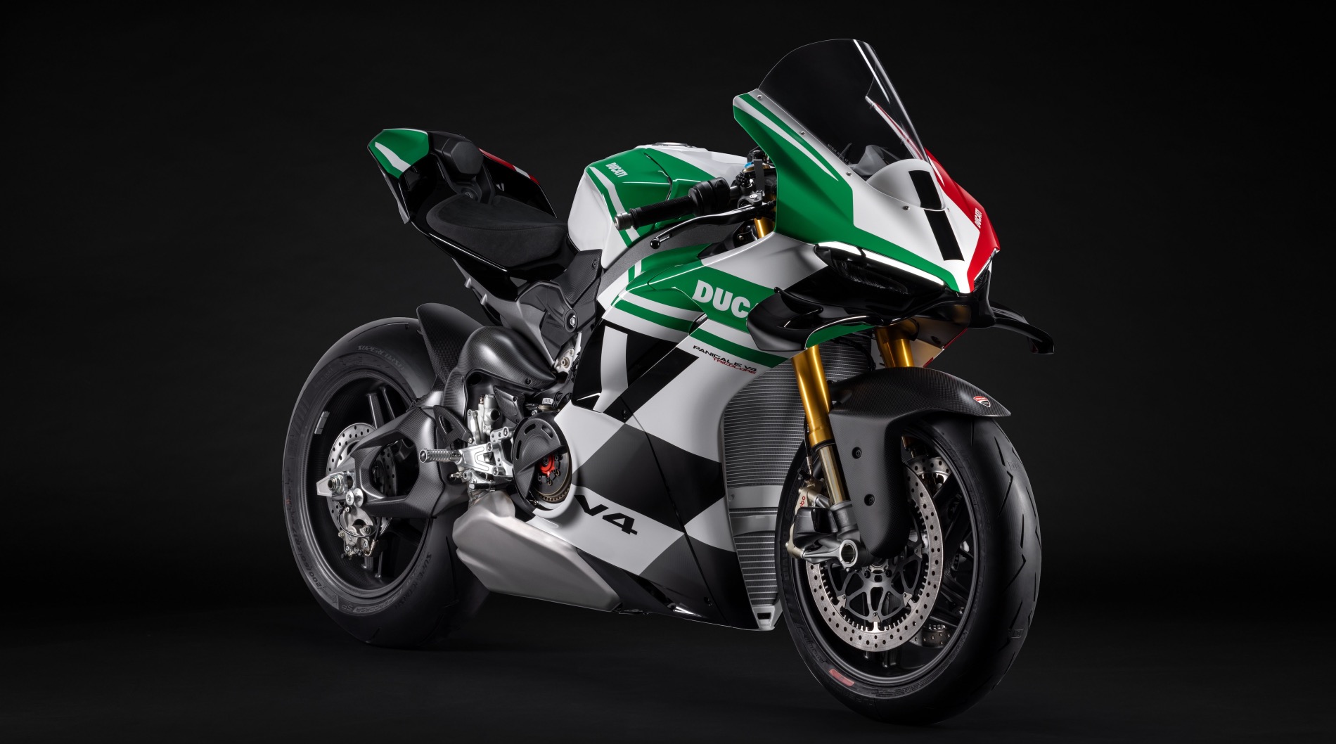 Η Panigale V4 Tricolore, σχεδιασμένη με περηφάνια από την Drudi Performance και το Centro Stile Ducati, βασίζεται στη νέα Panigale V4. Το λευκό, κόκκινο και πράσινο χρώμα της, που προτείνεται για πρώτη φορά στη μοτοσυκλέτα σε μια ασύμμετρη έκδοση, γιορτάζει τα χρώματα της Ιταλικής σημαίας συνδυάζοντάς τα με το ασπρόμαυρο της καρό σημαίας, το σύμβολο της νίκης, που εμφανίζεται στο κάτω μέρος του φέρινγκ. Οι πινακίδες με το νούμερο ένα, μπροστά και στα πλαϊνά του φέρινγκ, θυμίζουν αυτές των πιο σπορ και εξελιγμένων Ducati, όπως την Panigale V4 R ή την Multistrada Pikes Peak.