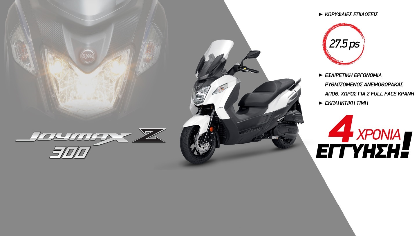 JOYMAX Z 300. Ένα άριστο σύνολο ποιότητας, πολυτέλειας, πρακτικότητας και οδηγικής συμπεριφοράς, με εξαιρετικά έξυπνες επιλογές από τη SYM, κυκλοφορεί στη μοναδική τιμή των 3.995 € και με Δωρεάν Επέκταση Εγγύησης στα 4 Χρόνια