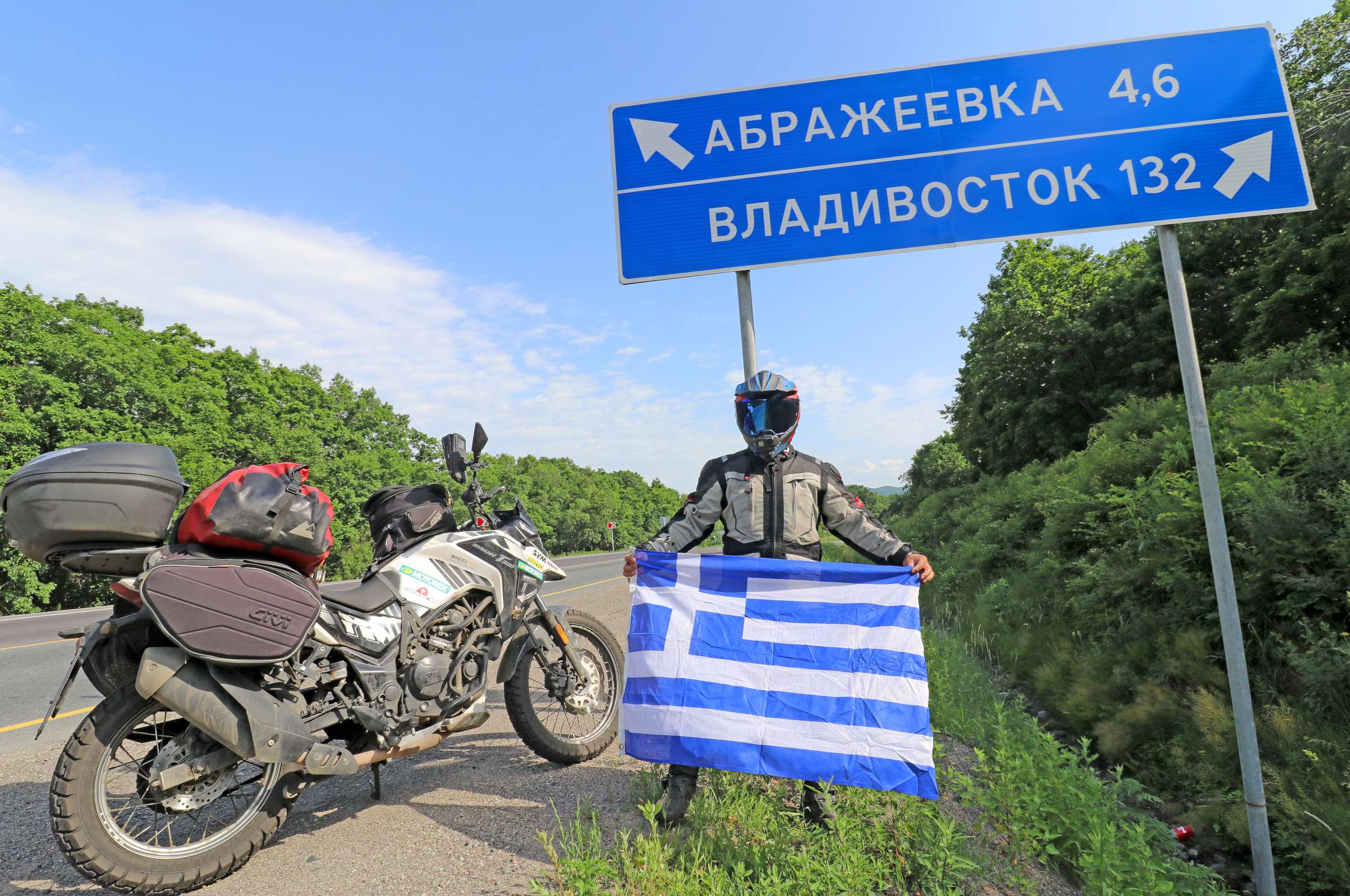 Μετά από 32 ημέρες και περίπου 14.000 χιλιόμετρα, ο Μητσάκης και η ΝΗ-Τ 300 σταμάτησαν στην εμβληματική πόλη-λιμάνι της Σιβηρίας, με συναισθήματα -που όπως αναφέρει και ο ίδιος- δύσκολα περιγράφονται με λόγια.