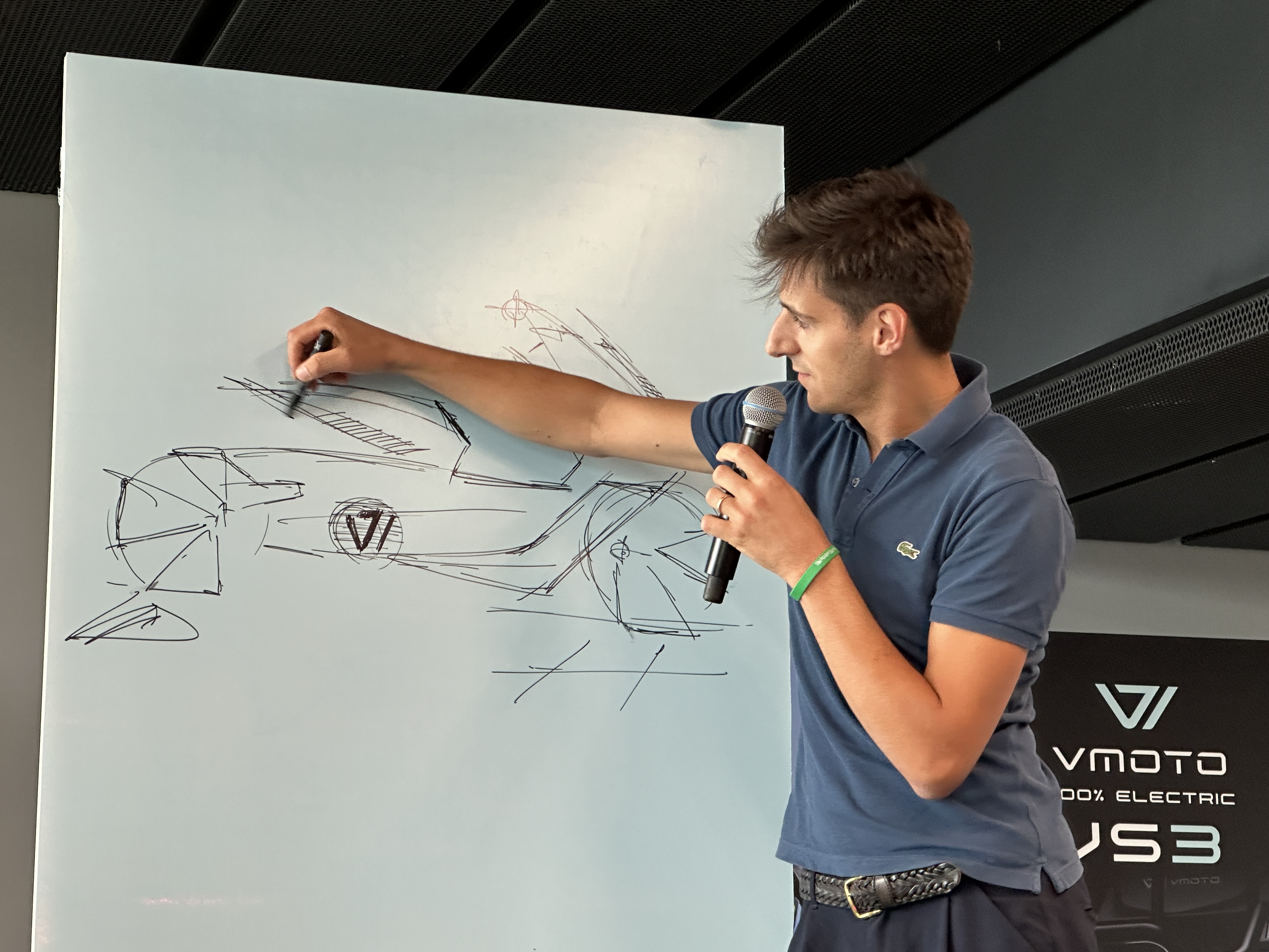 Ο νεαρός σχεδιαστής Daniele Mazzon κλήθηκε από τον πανέξυπνο CEO της Ιταλικής VMOTO να αποκαλύψει κάποια πράγματα για το σχεδιασμό που έγινε και μετά τις τελευταίες δοκιμές στην ιδιωτική αεροσήραγγα της Pininfarina S.p.A. Και εκείνος ανταποκρίθηκε ζητώντας ένα άσπρο φόντο από το πίσω μέρος μιας διαφημιστικής πινακίδας, πάνω στο οποίο σχεδίασε τις βασικές γραμμές, που όπως εξήγησε δεν είναι μόνο η προσωπική του σφραγίδα στο πρότζεκτ, αλλά το αποτέλεσμα της δουλειάς όλου του περίφημου σχεδιαστικού οίκου.