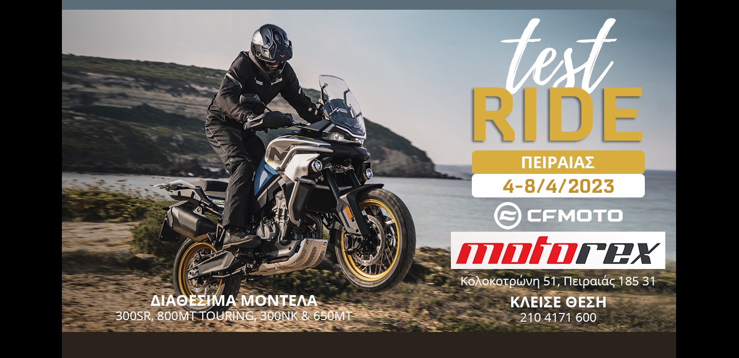 Η Muvus  CFMOTO ενημερώνει ότι τα μοντέλα 800ΜΤ Τouring, 300ΝΚ, 650ΜΤ και 300SR θα είναι διαθέσιμα για Test Ride στην εταιρεία Motorex στον Πειραιά, από τις 04 έως 08 Απριλίου 2023.