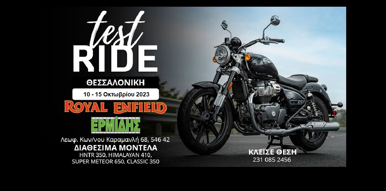 Η ROYAL ENFIELD Hellas ενημερώνει ότι τα μοντέλα CLASSIC 350, HNTR 350, METEOR 350 & SUPER METEOR 650 θα είναι διαθέσιμα για Test Ride στην Θεσσαλονίκη στις 10–15 Οκτωβρίου 2023, στην εταιρεία ΕΡΜΙΔΗΣ, Λεωφ. Κων/νου Καραμανλή 68, ΤΚ 54642 τηλ.: 2310852456 και email: info@ermidis.gr