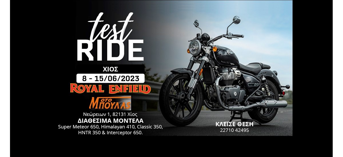 Tα μοντέλα Classic 350, HNTR 350, Himalayan 410, Super Meteor 650 & Interceptor 650 της Royal Enfield θα είναι διαθέσιμα για Test Ride στην εταιρεία εταιρεία MOTO BOULAS στη Χίο από τις 8 έως 15 Ιουνίου 2023.