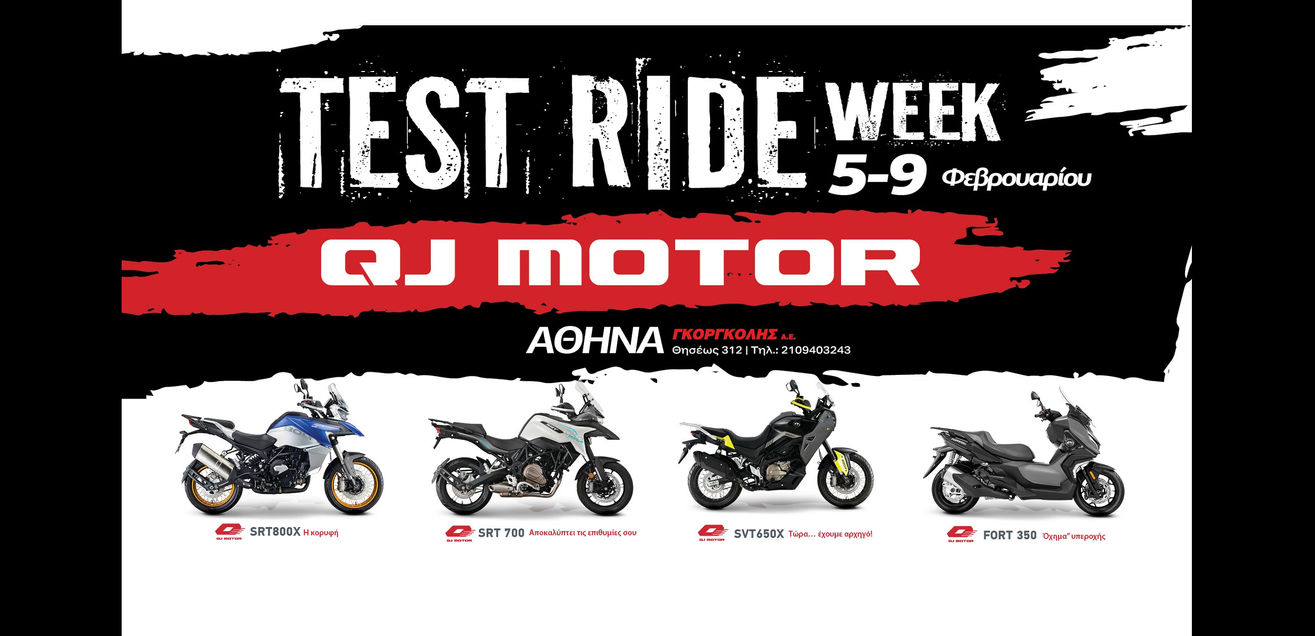 Την εβδομάδα που ξεκινά τη Δευτέρα 5 Φεβρουαρίου μέχρι και την Παρασκευή 9 Φεβρουαρίου, όλα τα μοντέλα της QJ MOTOR θα σας περιμένουν να τα δείτε από κοντά αλλά και να τα οδηγήσετε, στο πρώτο test ride event που διοργανώνει η εταιρεία μας στην κεντρική έκθεση, στη Λ.Θησέως (EΛ. Βεννιζέλου) 312 στην Καλλιθέα.