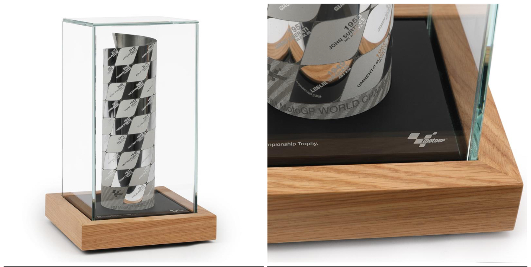 Το κύπελλο διαθέτει μια μεταλλική πλακέτα με χάραξη για κάθε Παγκόσμιο Πρωταθλητή από το 1949 και μετά. Αυτό το αποκλειστικό αντίγραφο από τον καλλιτέχνη που δημιούργησε το αυθεντικό θα κάνει τη συλλογή MotoGP™ του κάθε κατόχου του εμβληματική.