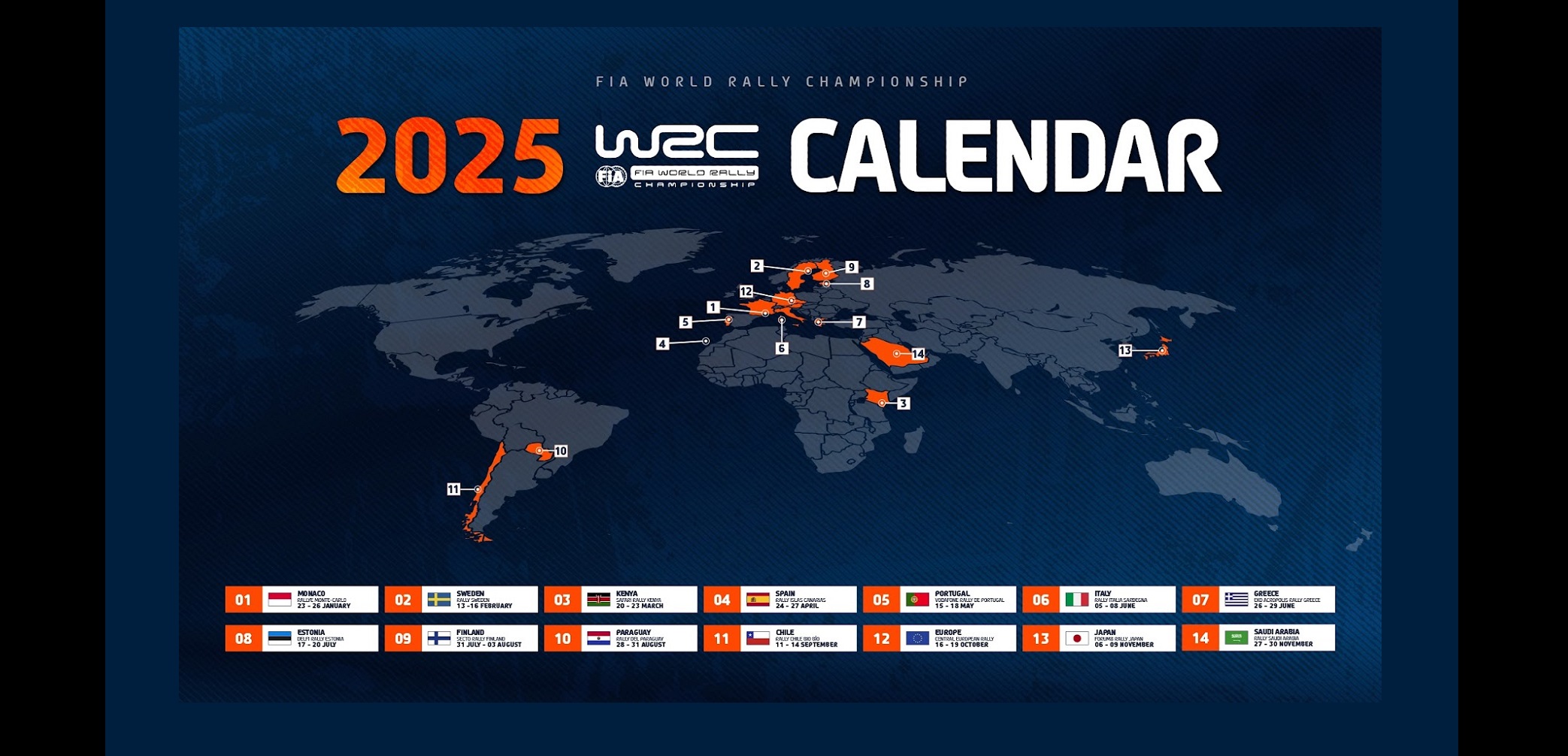 Το Πρωτάθλημα του 2025 θα είναι το μεγαλύτερο από το 2008, με 14 γύρους. Στο ημερολόγιο έχουν προστεθεί η Ισπανία, η Παραγουάη και η Σαουδική Αραβία, με το σύνολο των αγώνων να περιλαμβάνει όλες τις επιφάνειες - πάγο, χιόνι, χώμα, άσφαλτο και έρημο.