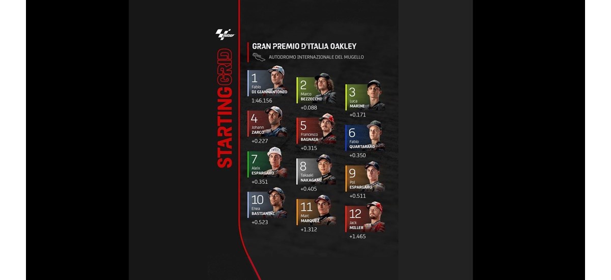 Στην κορυφαία κατηγορία MotoGP μετά από μια φοβερή μάχη τρεις Ιταλοί rookies - Fabio DI GIANNANTONIO, Marco BEZZECCHI & Luca MARINI όλοι με Ducati - κατέκτησαν τις 3 πρώτες θέσεις στο GP της πατρίδας τους. Ο Di Giannantonio βρήκε τελικά το ρυθμό και πέρασε μπροστά με χρόνο 1'46.156 για να κερδίσει την πρώτη pole position της καριέρας του στην μεγάλη κατηγορία, ακολουθούμενος από τους δυο αναβάτες Bezzecchi  και  Luca Marini της VR46 1-2, που βρέθηκαν στην 2η και 3η θέση τςη σχάρας εκκίνησης με χρόνους 1:46.244 και 1:46.327 αντίστοιχα.
