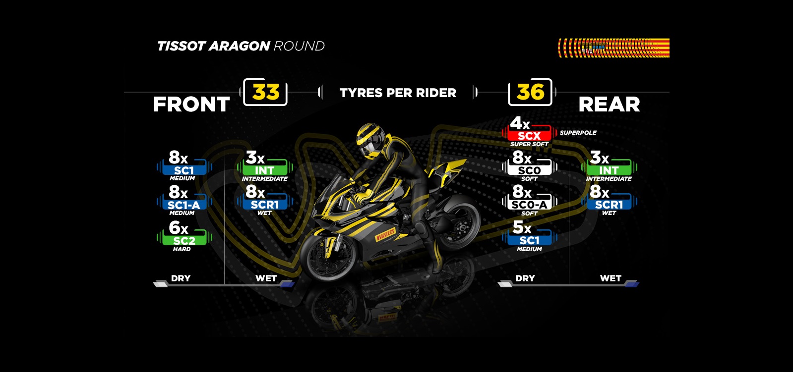 Η άλλη σημαντική αλλαγή αφορά την επιλογή για τις κατατακτήριες και τον αγώνα Superpole, που στην Aragón θα είναι το supersoft SCX αντί για το extra soft SCQ που έχουν διαθέσιμο οι αναβάτες σε πίστες με λιγότερο “άγρια” άσφαλτο.