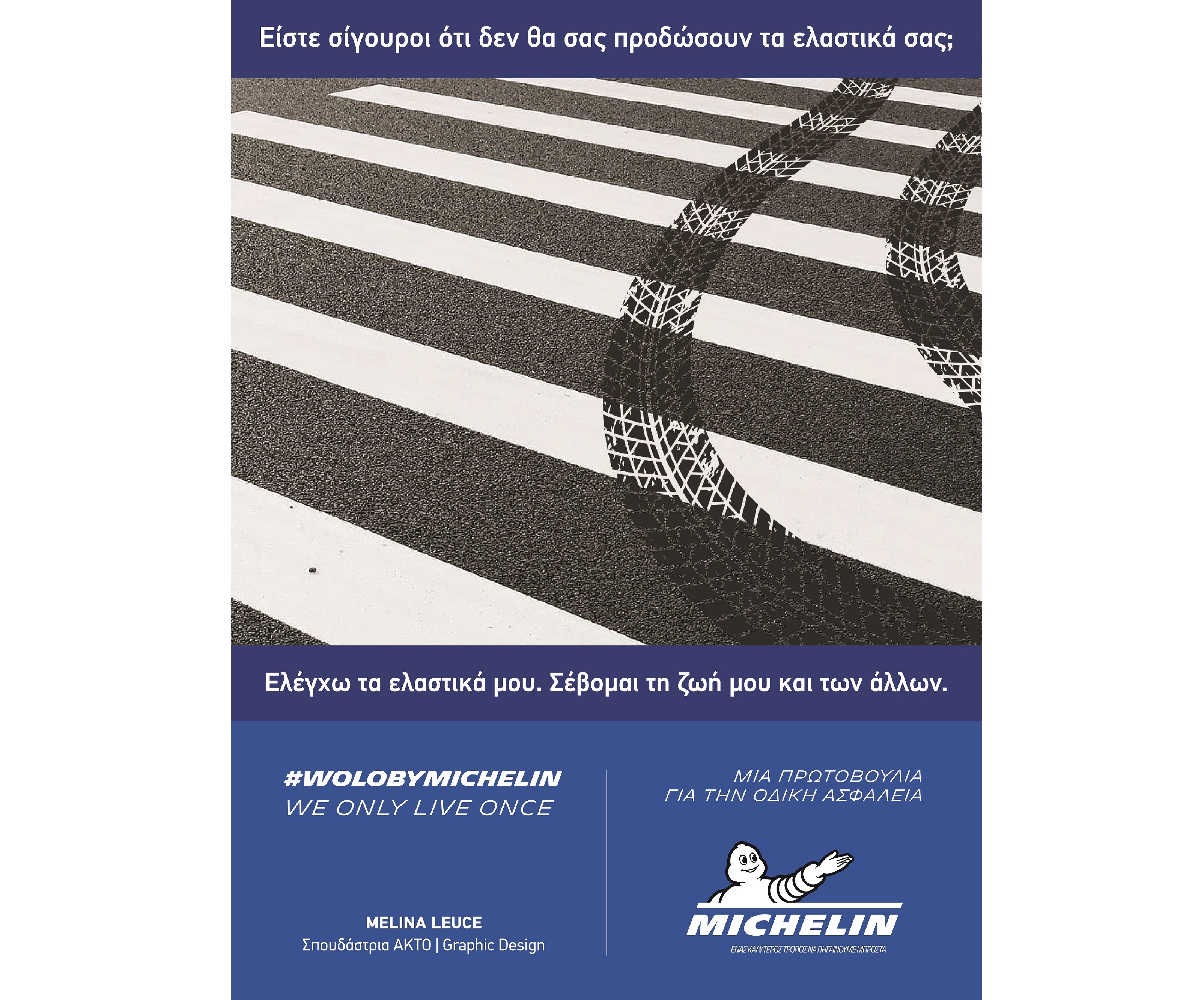 Με Motto #WOLO (WeOnlyLiveOnce) by Michelin, οι σπουδαστές Γραφιστικής του ΑΚΤΟ είχαν την ευκαιρία, στο πλαίσιο των προπτυχιακών σπουδών τους, να σχεδιάσουν δημιουργικές αφίσες που θα αναδείκνυαν πόσο σημαντικό είναι να προσέχουμε τα ελαστικά μας για να είμαστε ασφαλείς στο δρόμο. Άλλωστε, τα ελαστικά είναι το μοναδικό σημείο επαφής του οχήματος με το δρόμο.