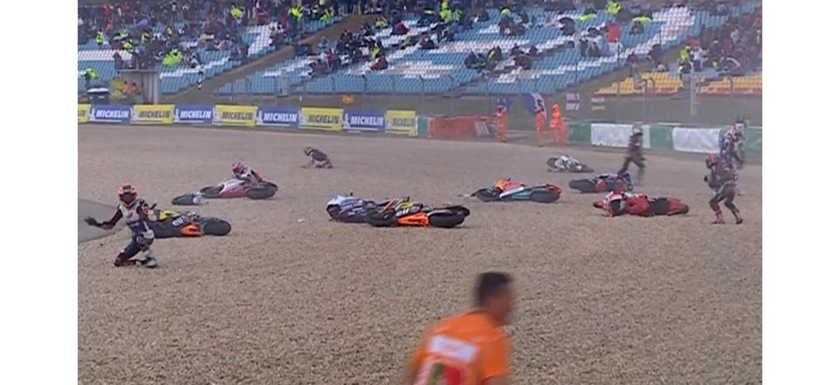 Όταν αυτή η βροχή εντάθηκε, έφερε καταστροφικές συνέπειες, με όχι μόνο τους τρεις πρώτους αλλά και άλλους οκτώ αναβάτες να πέφτουν σχεδόν ταυτόχρονα στην δεύτερη στορφή και να δημιουργούν ένα τρομακτικό θέαμα καταστροφής, φωτιάς και τυχερών αποδράσεων, με τον Ogura να αναγκάζεται ακόμη και να πηδήξει πάνω από τον Sam Lowes προτού η MarcVDS Kalex του Βρετανού αναβάτη πιάσει φωτιά.