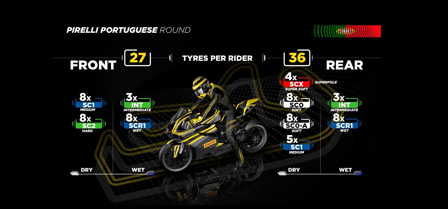 Ανάπτυξη SC0 για το WorldSBK: Για το μπροστινό μέρος, ο στάνταρ συνδυασμός SC1 και SC2 θα είναι διαθέσιμος στο WorldSBK, σε 8 ελαστικά η κάθε επιλογή ανά αναβάτη. Για πίσω εκτός από τα 8 ελαστικά του υπό ανάπτυξη SC0, θα υπάρχουν επίσης 8 στάνταρ ελαστικά SC0 και 5 του SC1, ενώ θα υπάρχουν και 4 ελαστικά SCX για την Superpole και τον Superpole Race. Για την SSP, θα υπάρχουν 6 ελαστικά  SC1 και άλλα τόσα SC2 για μπροστά, τα οποία μπορούν να συνδυαστούν με SC1 ή SC0 (σε ποσότητες 7 και 4 τεμαχίων αντίστοιχα) για πίσω.  Όλες οι επιλογές για την τελευταία κατηγορία είναι στάνταρ.