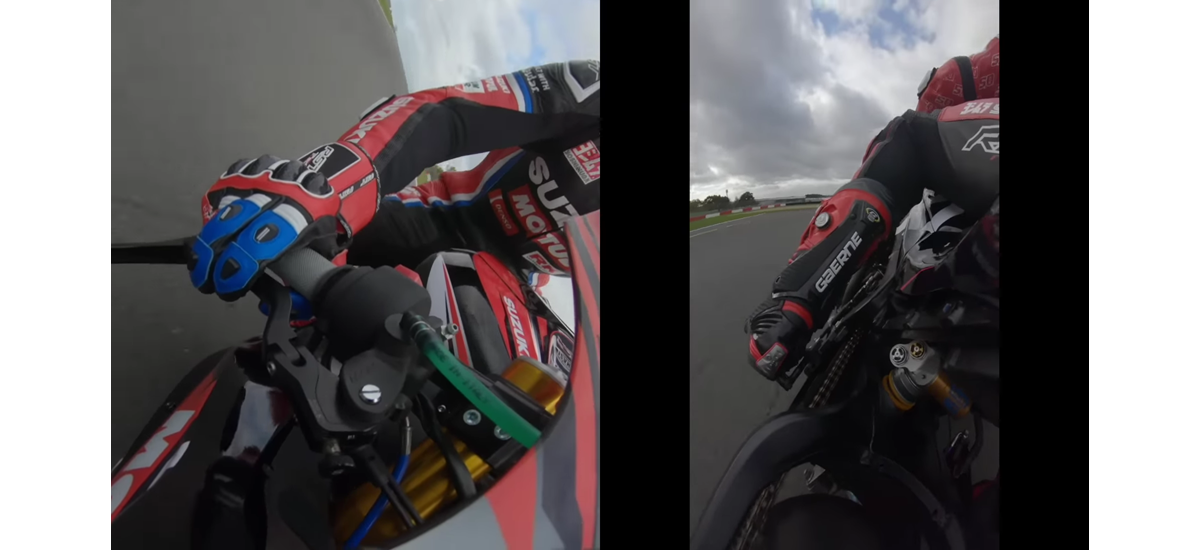 Με τη βοήθεια δύο συγχρονισμένων καμερών, ο αναβάτης της Suzuki απεικονίζει τον λεπτό χορό μεταξύ του χεριού του γκαζιού (δεξιά) και του ποδιού που αλλάζει ταχύτητες (αριστερά). Αυτή η σχέση είναι κρίσιμη για ομαλά κατεβάσματα που οδηγούν στην είσοδο στη στροφή. Όπως δηλώνει ο Guintoli, οι αναβάτες πρέπει να αρχίσουν να κατεβάζουν ταχύτητα μόλις κλείσουν το γκάζι. Αυτή η προσέγγιση διατηρεί τη σταθερότητα, με τη μοτοσυκλέτα πιθανώς όρθια σε αυτήν την πρώιμη φάση φρεναρίσματος.