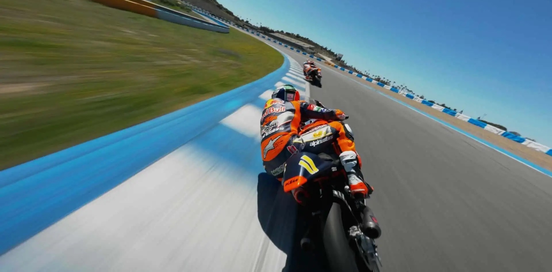 Η επόμενη πρόκληση αφού ξεπεράστηκαν όλα τα προβλήματα που έπρεπε να αντιμετωπίσουν για να ακολουθήσουν ένα μονοθέσιο της F1, ήταν για στην Ολλανδική ομάδα Drone Gods μια νέα πρόκληση: να ακολουθεί αλλά και να βρίσκεται δίπλα με τις μοτοσυκλέτες της KTM προδιαγραφών της κατηγορίας Moto3 στην πίστα της Jerez στην Ισπανία, καθώς οι αναβάτες είχανε την προετοιμασία για το Red Bull MotoGP Rookies Cup. Τώρα, για τους μη μυημένους, στις μικρές αυτές μοτοσυκλέτες μπορεί να φαίνεται ευκολότερο να τις ακολουθήσει αυτό το drone από ότι ένα μονοθέσιο της F1. Αλλά αυτή η νέα πρόκληση σήμαινε ότι ο πιλότος του drone θα έπρεπε να κάνει μία πλοήγηση πολύ κοντινής παρακολούθησης, σε μάχες που γίνονται τροχό με τροχό. Αυτές οι μάχες είναι οι πλησιέστερες που γίνονται στις κατηγορίες αγώνων με 2 τροχούς στον κόσμο.