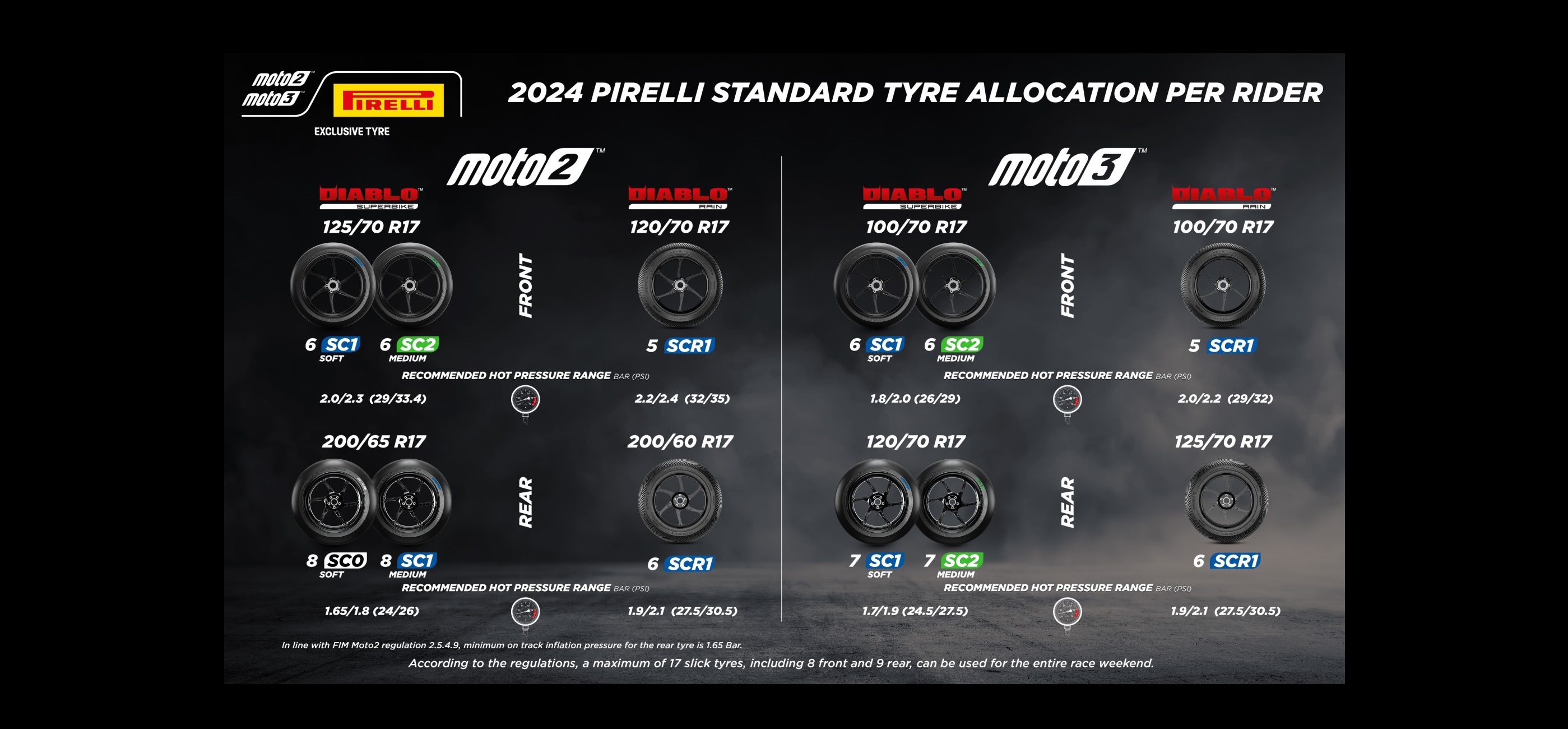 · Κατανομή ελαστικών για το MotoGP Rookies Cup: κάθε αναβάτης θα μπορεί να χρησιμοποιήσει έως και 4 σετ ελαστικών SC2 στο στεγνό εμπρός και πίσω. Σε περίπτωση βροχής, μπορούν να χρησιμοποιήσουν τα βρόχινα SCR1.