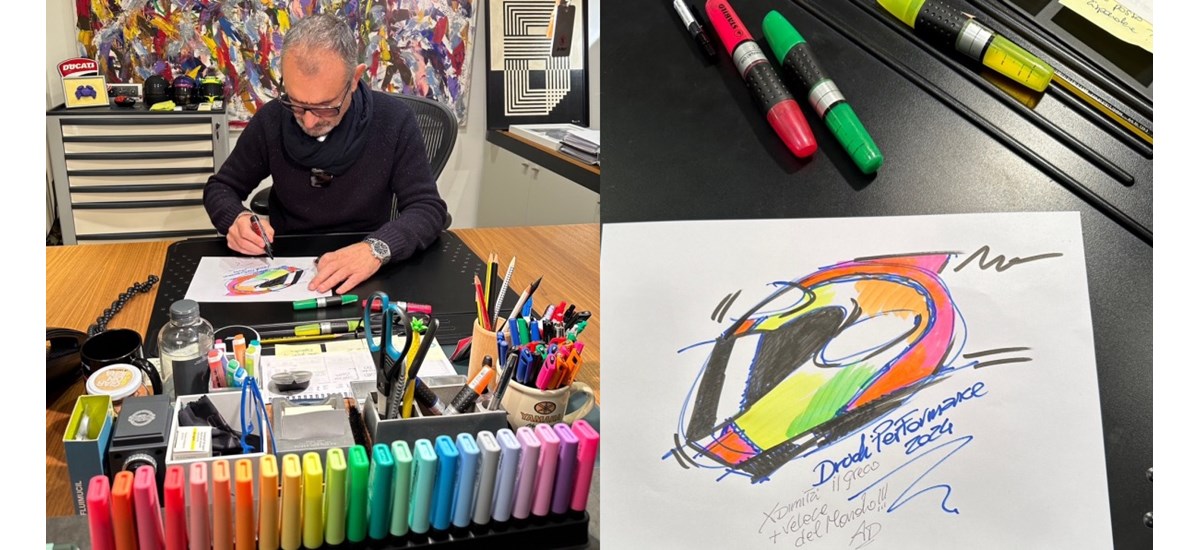 O Aldo Drudi, o διάσημος σχεδιαστής που διαπρέπει εδώ και 45 χρόνια στο χώρο του design για το μηχανοκίνητο αθλητισμό, αλλά και για άλλους τομείς, όπως τα σκάφη και η ένδυση, σχεδιάζει ένα κράνος στο προσωπικό του γραφείο της Drudi Performance (στο Riccione, δίπλα στο Rimini) και το αφιερώνει στον Δημήτρη Διατσίδη για το website www.MGP.gr και το περιοδικό MOTOGP WORLD!