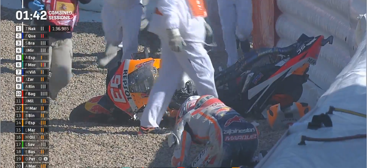 Σε ένα δραματικό session με πάρα πολλές εκπλήξεις, η μεγαλύτερη από αυτές (και αρνητική) ήταν η πτώση του Marc Marquez λίγο πριν το τέλος των δοκιμαστικών. Ο Ισπανός αναβάτης έχασε τον έλεγχο της μοτοσυκλέτας του στην είσοδο της 7ης στροφής. Προς το παρόν φαίνεται να μην υπάρχει κάποιος εμφανής τραυματισμός αλλά θα επανέλθουμε σύντομα με περισσότερες πληροφορίες.
