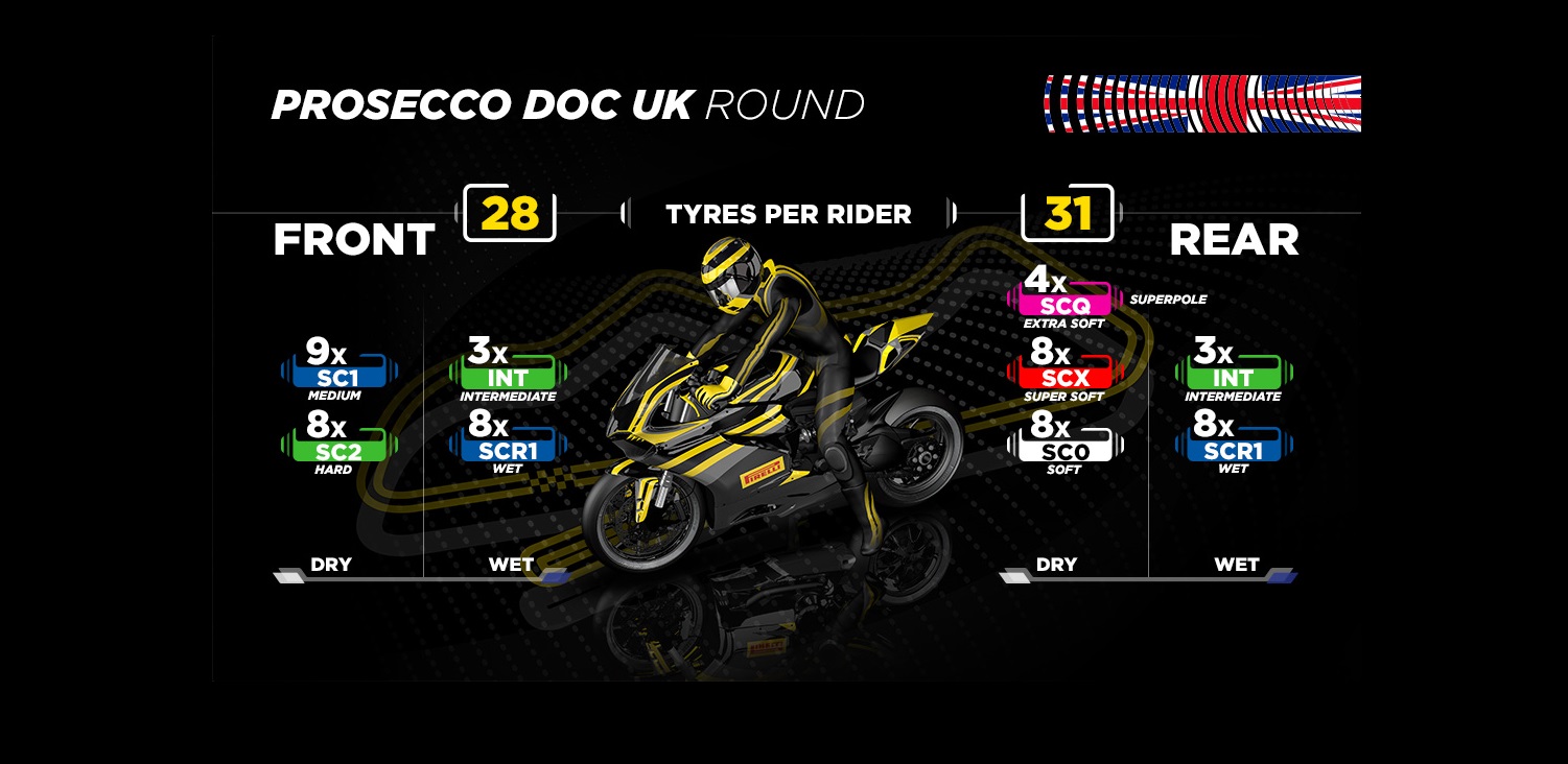 Για τον γύρο του Donington Park, η Pirelli θα βασιστεί στις ίδιες συνθέσεις που χρησιμοποιούνται στο BSB (British Super Bike), δηλαδή μαλακά πίσω ελαστικά σε συνδυασμό με SC1 και SC2 μπροστά, με μόνη εξαίρεση το μπροστινό D0444 στην κατηγορία WorldSSP