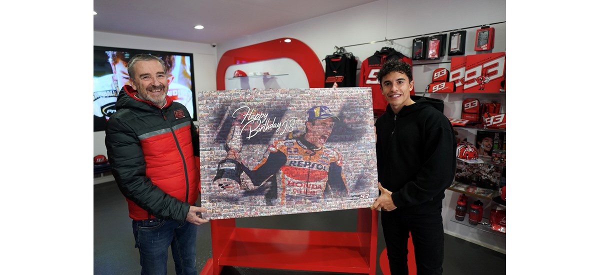 Χαμογελαστός και ευδιάθετος, ο Marc Marquez παραλαμβάνει το όμορφο και έξυπνο δώρο που του ετοίμασε για τα γενέθλιά του το Fan Club του.