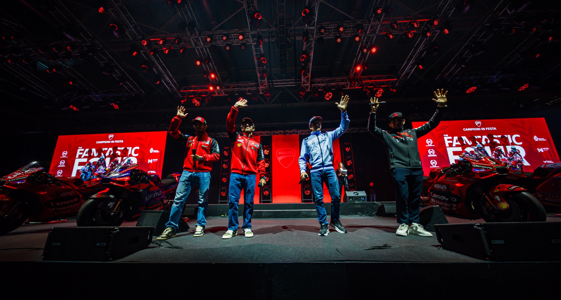 Τέλος, το αποκορύφωμα του σόου έφτασε με τους αναβάτες της Ducati “Fantastic Four”, κυρίαρχους του Παγκόσμιου Πρωταθλήματος MotoGP με 19 νίκες σε 20 συνολικά Αγώνες, που ανέβασαν τον ενθουσιασμό του κόσμου. Ο Παγκόσμιος Πρωταθλητής Jorge Martín, ο Ιταλός “είδωλο” Francesco “Pecco” Bagnaia μαζί με τον Marc Márquez και τον Enea Bastianini ανέβηκαν στη σκηνή, ανταλλάσσοντας ερωτήσεις και απόψεις μεταξύ τους και λαμβάνοντας τον θερμό φόρο τιμής του κοινού για μια σεζόν που ανέβασαν τις Desmosedici GP σε ασύλληπτο επίπεδο.