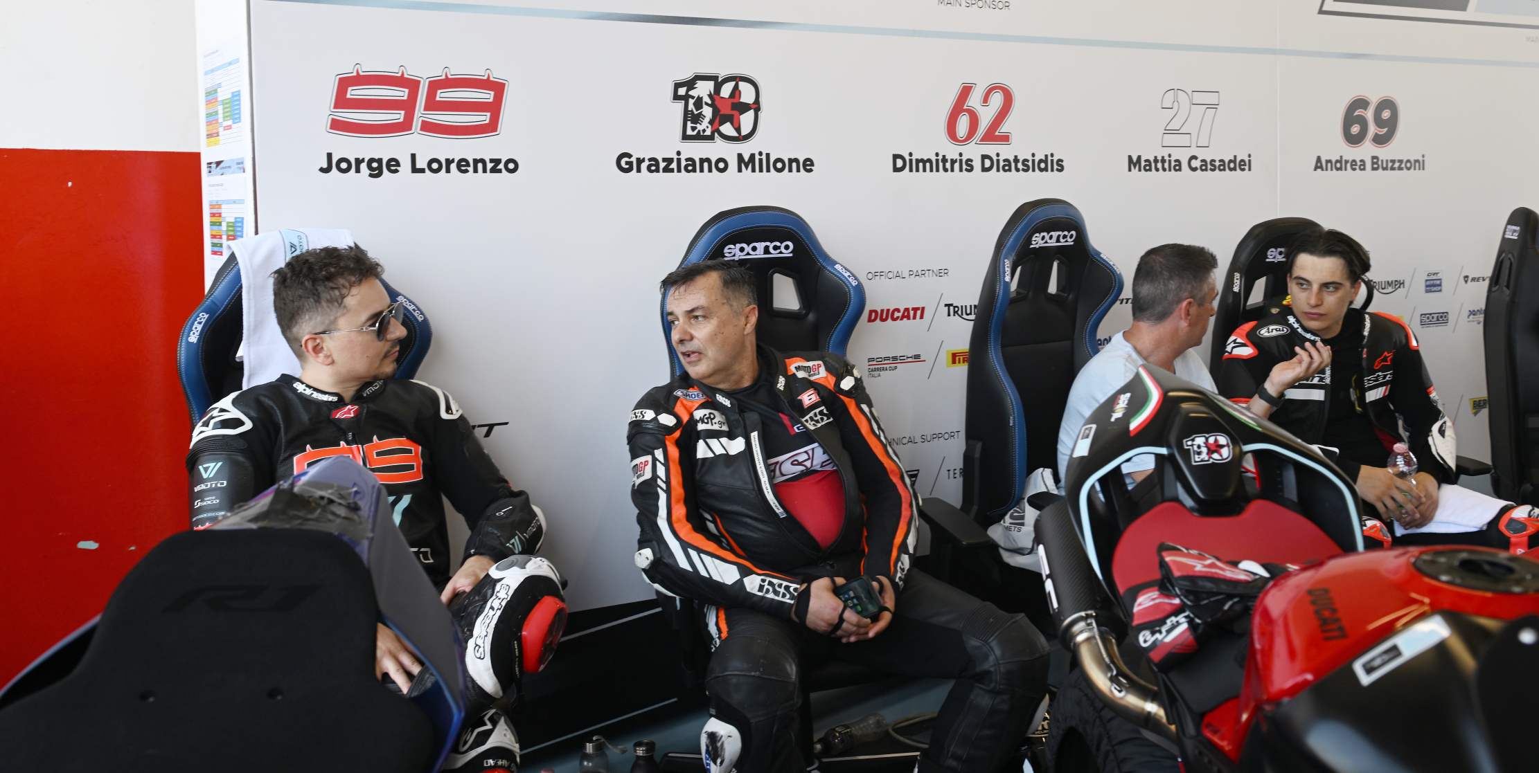 H διαφορά με τις προηγούμενες δύο φορές ήταν ότι αυτή τη φορά ο καλός μου φίλος με τοποθέτησε στο ειδικό VIP γκαράζ, μαζί και δίπλα σε αυτούς! Συνολικά 12 οδηγοί με τις μοτοσυκλέτες μας μοιραστήκαμε το γκαράζ της Ιταλικής πίστας, ο καθένας με την ειδική θέση του, με το όνομά του και το νούμερό του γραμμένο στον τοίχο του γκαράζ και με την ομάδα μηχανικών που φρόντιζε τη μοτοσυκλέτα του. Για την περίσταση είχε φροντίσει και είχα στη διάθεσή μου μια Ducati Panigale V4S με λάστιχα Pirelli Supercorsa SP και το #62 πάνω της. Paddock Girls με τις ομπρέλες της Vmoto φρόντιζαν να κάνουν τη ζωή μας ευκολότερη κάτω από το δυνατό ήλιο και σίγουρα να ομορφαίνουν το γκαράζ. Πραγματικά ένα VIP περιβάλλον.