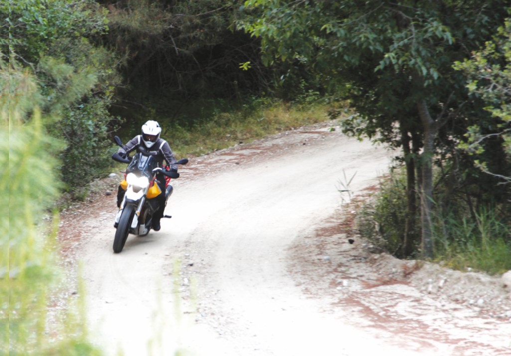 Από το Κάστρο ο εσωτερικός δρόμος προς Αμφίκλεια και Λαμία, μέσω Μπράλου, μας έδωσε την ευκαιρία να δούμε και την εξαιρετική λειτουργία του συνόλου πλαίσιο-αναρτήσεις-φρένα! Η νεοκλασική στην όψη εντούρο, είναι μια σύγχρονη μοτοσυκλέτα που φρενάρει, στρίβει και πλαγιάζει εντυπωσιακά. Στις στροφές του Μπράλου τα ελαστικά με σαμπρέλα σε διαστάσεις 110/80-19 εμπρός και 150/70-17 πίσω, δούλεψαν τέλεια και έφθασαν σε οριακές κλίσεις, ακολουθώντας χωρίς κανένα πρόβλημα τα 120/70-17 και 190/55-17 της διπλάσιας σε δύναμη εντούρο που είχαμε στην παρέα!