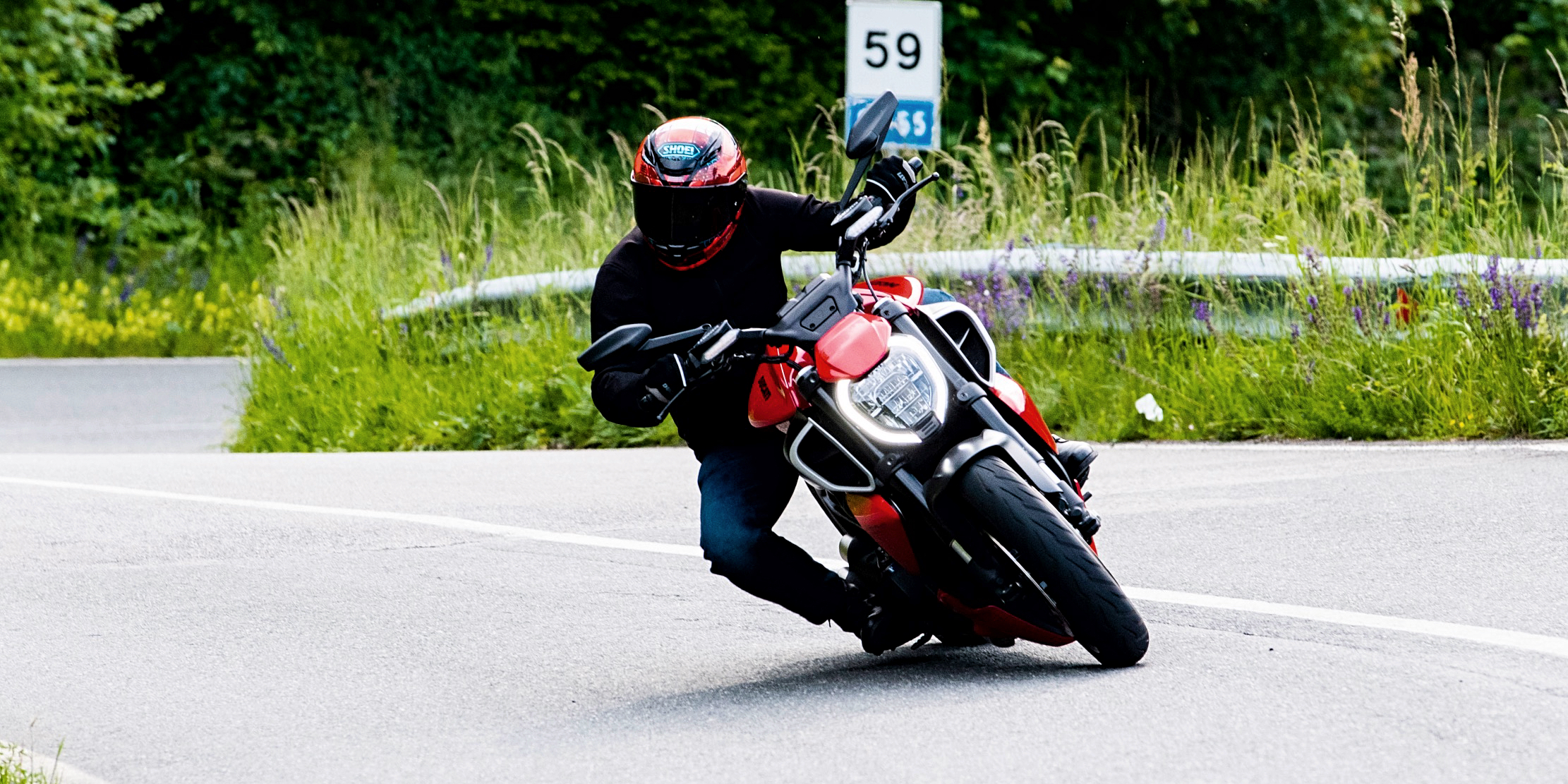 Ανεβαίνοντας το βουνό, στα Απέννινα, οι στροφές που οδηγούν προς το Passo Della Futa είναι κυρίως μεσαίας ταχύτητας, χωρίς να λείπουν και οι πιο ανοικτές, αλλά και με κάποιες φουρκέτες στις οποίες κατεβάζεις 1η ταχύτητα στο κιβώτιο. Η άσφαλτος προσφέρει υψηλή πρόσφυση και τα Rosso III έρχονται γρήγορα σε θερμοκρασία λειτουργίας που επιτρέπει πλαγιάσματα με μεγάλες κλίσεις που “μαυρίζουν” μέχρι το τέρμα το τεράστιο πίσω ελαστικό. Η αίσθηση αυτής της πρόσφυσης στις εξόδους των στροφών, σου δίνει τη δυνατότητα να ανοίξεις το γκάζι και να νιώσεις την τρομερή ροπή του κινητήρα να ωθεί τη μοτοσυκλέτα προς την επόμενη στροφή. Μια φοβερή επιτάχυνση που σε κάνει να εκτιμάς ακόμη περισσότερο τον όρο “muscle bike”, ενώ τα φρένα θα λειτουργήσουν ανάλογα άψογα προσφέροντας μια εκπληκτική επιβράδυνση. Η Diavel V4 κινείται τόσο γρήγορα που θα εκπλήξει και κάποιος Ιταλούς με σούπερσπορ και γυμνές μοτοσυκλέτες, με τους οποίους είχαμε την ευκαιρία να οδηγήσουμε για αρκετά μεγάλο μέρος της ανάβασης.