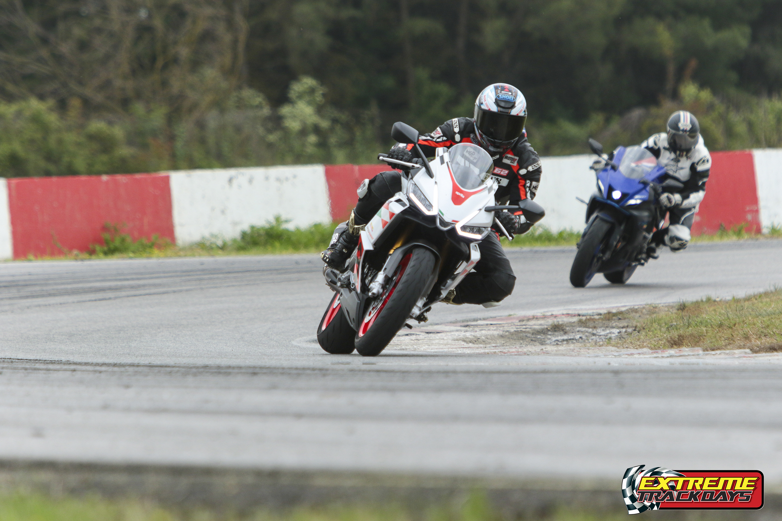 Ξεκινώντας το Σάββατο που είχε καλό καιρό πρώτα με την R7 που φορούσε τα εξαιρετικά ελαστικά Continental Contisport Attack 4 διαστάσεων 120/70 ZR 17 εμπρός και 180/55 ZR 17 πίσω, άρχισα να κάνω τους πρώτους γύρους και χωρίς προσωπικά να έχω πολύ εμπειρία, πολύ εύκολα ακούμπησαν τα γόνατα στην άσφαλτο στις κλειστές στροφές ενώ και στις πιο ανοιχτές ήταν πολύ κοντά δείχνοντας το πόσο φιλική και σταθερή είναι για να κινείται σε γρήγορους ρυθμούς. Η Yamaha R7 έχει έναν δικύλινδρο κινητήρα 689 κ.εκ. με ισχύ 73.4 ίππων στις 8,750 σ.α.λ., μέγιστη ροπή 67 Nm στις 6,500 σ.α.λ. και με βάρος γεμάτη στα 188 κιλά. Kινείται με ευελιξία χωρίς να δείχνει αδύναμη, έχοντας άμεση απόκριση στο γκάζι και ροπή από χαμηλά. Oi μάζες της είναι συγκεντρωμένες στο κέντρο και σε αυτό συμβάλει το στενό πλαίσιο αλλά και το ψαλίδι πίσω με το οριζόντιο ρυθμιζόμενο αμορτισέρ που συνδυάζεται με μοχλικό σύστημα για καλύτερη λειτουργία. Το ρυθμιζόμενο εμπρός ανεστραμμένο πιρούνι της KYB συμβάλει στη σταθερότητα και στο σωστό φρενάρισμα με τα φρένα να είναι και αυτά αποτελεσματικά. Κατά το φρενάρισμα στα κατεβάσματα ταχυτήτων ο συμπλέκτης με το σύστημα A&S αναλαμβάνει να διατηρεί το φρενάρισμα του πίσω τροχού σταθερό, ελέγχοντας την ολίσθηση του συμπλέκτη προς όφελος της πρόσφυσης του ελαστικού. Όλα τα παραπάνω συντελούν στην ευελιξία και τη σταθερότητα, ενώ και η θέση οδήγησης είναι ευνοϊκή για εύκολη τοποθέτηση του σώματος στις στροφές με αποτέλεσμα η οδήγηση να γίνεται εύκολη υπόθεση. Η μεγάλη ροπή επιτρέπει στις εξόδους των στροφών να ανοίγει λίγο η τροχιά της μοτοσυκλέτας αλλά χωρίς φόβο να γλιστρήσει ή να ανοιχτεί πολύ. Αυτή η συμπεριφορά είναι η ιδανική για τον λιγότερο έμπειρο αναβάτη καθώς δεν φοβίζει και του δίνει σιγουριά να κινηθεί στην ιδανική γραμμή, ενώ και ο πιο έμπειρος δεν θα δυσαρεστηθεί από έλλειψη δύναμης και ταχύτητας εξόδου από τις στροφές.